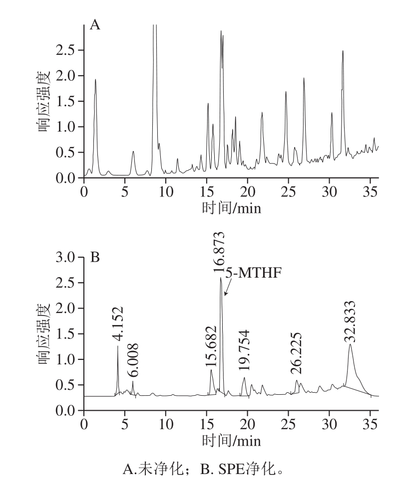 在HPLC分析样品之前,纯化样品可提高叶酸检测准确度和回收率,降低检出限,减少提取液中内源成分干扰。固定叶酸结合蛋白亲和色谱[27-29]净化提取液时对5-甲酰四氢叶酸的亲和吸附力较低,会导致其损失[30-31],本实验使用强阴离子交换(SAX)SPE对提取液进行净化[32]。SPE洗脱液收集体积的量会影响提取的回收率。当截留体积过小时,叶酸收集不完全;当截留体积过大时,会导致洗脱液中叶酸浓度降低,影响测定准确性。因此需准确截取含有叶酸的洗脱液部分。本实验在洗脱过程中,每0.1 mL收集1 次洗脱液,然后依次测定,结果表明收集洗脱液时可丢弃首先流出的0.7 mL;中间段2.5 mL洗脱液中存在可检出目标物5-MTHF,回收率达到98.5%。采用以上洗脱收集方式,SPE对叶酸提取液净化效果显著。未使用SPE净化处理组中杂质多,5-MTHF目标峰与相邻杂质峰部分重合,无法准确定量5-MTHF(图6A),使用SPE净化后,5-MTHF相邻杂质峰消失,且5-MTHF峰形对称性良好,干扰物少,在16.87 min处出峰(图6B)。