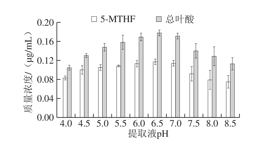 pH值的变化会影响5-MTHF及其他形态叶酸的稳定性,也会影响α-淀粉酶、蛋白酶以及大鼠血清中叶酸轭合酶的酶活,因此考察pH 4.0、4.5、5.0、5.5、6.0、6.5、7.0、7.5、8.0、8.5浸提液对5-MTHF和总叶酸提取的影响。