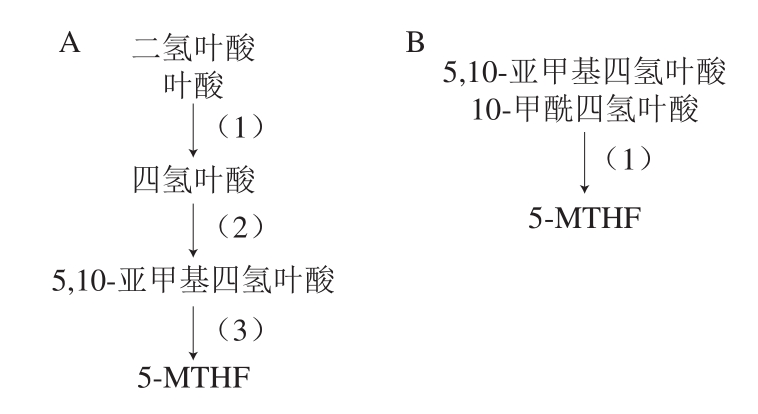 叶酸是一类对人体健康至关重要的B族维生素,其缺乏是一个全球性的健康问题[1],会导致如巨幼细胞贫血[2],心血管疾病恶化[3]和某些类型癌症等疾病[4];胎儿缺乏会发生神经管缺陷等相关疾病[5]。叶酸由对氨基苯甲酸连接蝶呤组成,其中对氨基苯甲酸能够与一个或多个谷氨酸偶联,形成单谷氨酸叶酸或多谷氨酸叶酸[6]。天然叶酸以四氢叶酸及其衍生物的形式存在[7],如5-甲基四氢叶酸(5-methyl-tetrahydrofolate,5-MTHF)、5-甲酰四氢叶酸、10-甲酰四氢叶酸等。5-MTHF是食品中最主要的天然叶酸形态[8-10],在一些主要蔬菜中,5-MTHF含量超过叶酸总量的85%,而在某些水果中则接近100%[11-13];5-MTHF生物活性高,是唯一可直接作用于甲基化循环的叶酸形态,缺乏5-MTHF易诱发高同型半胱氨酸血症;我国已将5-MTHF作为食品营养强化剂列入食品添加剂的范围,对其添加量、摄入量和适宜人群等做了相应规定。
