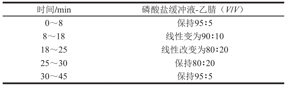 梯度洗脱程序:流动相为33 mmol/L pH 2.3磷酸盐缓冲液和乙腈;流速0.4 mL/min;进样量20 μL;柱温30 ℃。流动相比例变化如表1所示。