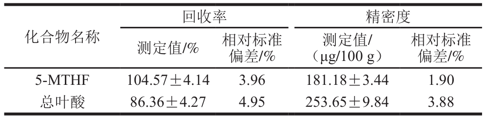 化合物名称回收率 精密度测定值/% 相对标准偏差/%测定值/(μg/100 g)相对标准偏差/%5-MTHF 104.57±4.14 3.96 181.18±3.44 1.90总叶酸 86.36±4.27 4.95 253.65±9.84 3.88