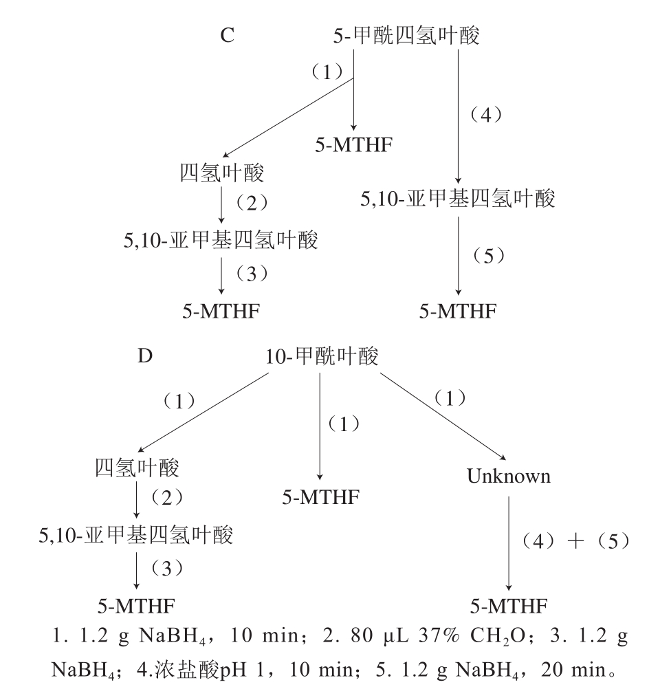由于玉米中天然叶酸形态多样,主要形态为5-MTHF,为简化玉米中总叶酸含量的分析,将各种形态的叶酸全转化为5-MTHF以测定玉米样品中总叶酸含量,转化步骤参考Ndaw等[25]的方法(图1)。