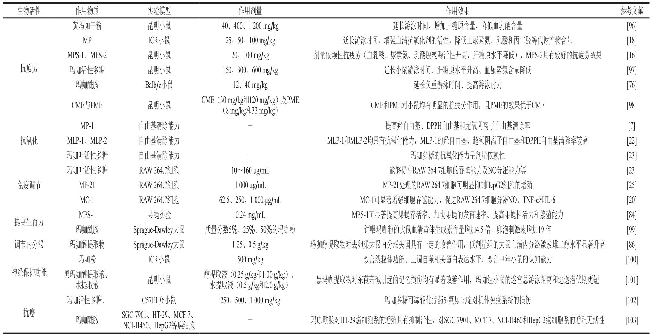 生物活性 作用物质 实验模型 作用剂量作用效果 参考文献抗疲劳黄玛咖干粉 昆明小鼠 40、400、1 200 mg/kg 延长游泳时间、增加肝糖原含量、降低血乳酸含量 [96]MP ICR小鼠 25、50、100 mg/kg 延长游泳时间,增强血清抗氧化剂的活性,降低血尿素氮、乳酸和丙二醛等代谢产物含量 [18]MPS-1、MPS-2 昆明小鼠 20、100 mg/kg 剂量依赖性抗疲劳(血乳酸、尿素氮、乳酸脱氢酶活性升高,肝糖原水平降低),MPS-2具有较好的抗疲劳效果 [16]玛咖活性多糖 昆明小鼠 150、300、600 mg/kg 延长小鼠游泳时间、肝糖原水平升高、血尿素氮含量降低 [97]玛咖酰胺 Balb/c小鼠 12、40 mg/kg 延长负重游泳时间、提高游泳耐力 [76]CME与PME 昆明小鼠 CME(30 mg/kg和120 mg/kg)及PME(8 mg/kg和32 mg/kg) CME和PME对小鼠均有明显的抗疲劳作用,且PME的效果优于CME [98]抗氧化免疫调节MP-1 自由基清除能力 - 提高羟自由基、DPPH自由基和超氧阴离子自由基清除率 [7]MLP-1、MLP-2 自由基清除能力 - MLP-1和MLP-2均具有抗氧化能力,MLP-1的羟自由基、超氧阴离子自由基和DPPH自由基清除率较高 [22]玛咖叶活性多糖 自由基清除能力 - 玛咖多糖的抗氧化能力呈剂量依赖性 [23]玛咖叶活性多糖 RAW 264.7细胞 10~160 μg/mL 能够提高RAW 264.7细胞的吞噬能力及NO分泌能力等 [23]MP-21 RAW 264.7细胞 1 000 μg/mL MP-21处理的RAW 264.7细胞可明显抑制HepG2细胞的增殖 [25]MC-1 RAW 264.7细胞 62.5、250、1 000 μg/mL MC-1可显著增强细胞吞噬能力,促进RAW 264.7细胞分泌NO、TNF-α和IL-6 [20]MPS-1 果蝇实验 0.24 mg/mL MPS-1可显著提高果蝇存活率、加快果蝇的发育速率、提高果蝇性活力和繁殖能力 [84]玛咖酰胺 Sprague-Dawley大鼠 质量分数5%、25%、50%的玛咖粉 饲喂玛咖粉的大鼠血清黄体生成素含量增加4.5 倍,卵泡刺激素增加19 倍 [99]调节内分泌 玛咖醇提取物 Sprague-Dawley大鼠 1.25、0.5 g/kg 玛咖醇提取物对去卵巢大鼠内分泌失调具有一定的改善作用,低剂量组的大鼠血清内分泌激素雌二醇水平显著升高 [86]提高生育力神经保护功能玛咖粉 ICR小鼠 500 mg/kg 改善线粒体功能、上调自噬相关蛋白表达水平、改善中年小鼠的认知能力 [100]黑玛咖醇提取液、水提取液 昆明小鼠 醇提取液(0.25 g/kg和1.00 g/kg)、水提取液(0.5 g/kg和2.0 g/kg) 黑玛咖提取物对东莨菪碱引起的记忆损伤均有显著改善作用,玛咖组小鼠的迷宫总游泳距离和逃逸潜伏期更短 [101]抗癌玛咖活性多糖、 C57BL/6小鼠 250、500、1 000 mg/kg 玛咖多糖可减轻化疗药5-氟尿吡啶对机体免疫系统的损伤 [102]玛咖酰胺 SGC 7901、HT-29、MCF 7、NCI-H460、HepG2等癌细胞 - 玛咖酰胺对HT-29癌细胞系的增殖具有抑制活性,对SGC 7901、MCF 7、NCI-H460和HepG2癌细胞系的增殖无活性 [103]
