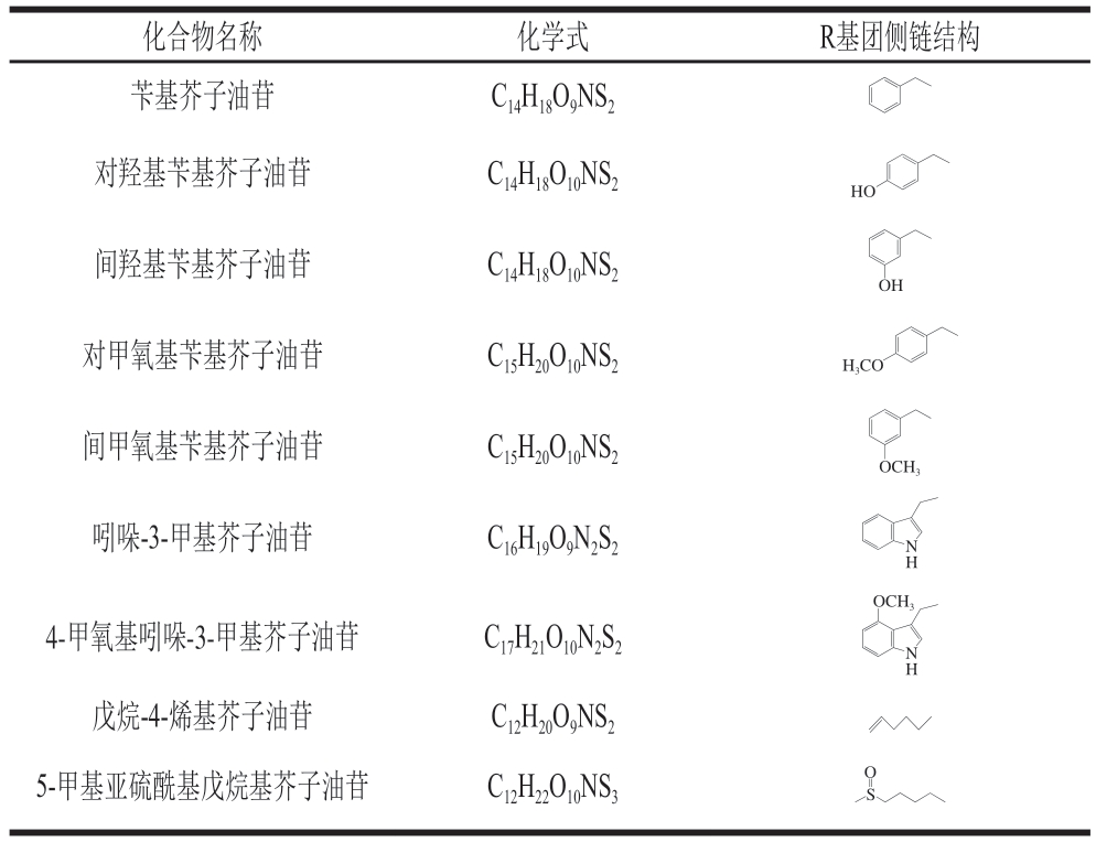 化合物名称 化学式 R基团侧链结构苄基芥子油苷 C14H18O9NS2对羟基苄基芥子油苷 C14H18O10NS2 HO间羟基苄基芥子油苷 C14H18O10NS2 OH对甲氧基苄基芥子油苷 C15H20O10NS2 H3CO间甲氧基苄基芥子油苷 C15H20O10NS2 OCH3吲哚-3-甲基芥子油苷 C16H19O9N2S2 NH OCH3 4-甲氧基吲哚-3-甲基芥子油苷 C17H21O10N2S2N H戊烷-4-烯基芥子油苷 C12H20O9NS2 5-甲基亚硫酰基戊烷基芥子油苷 C12H22O10NS3 S O