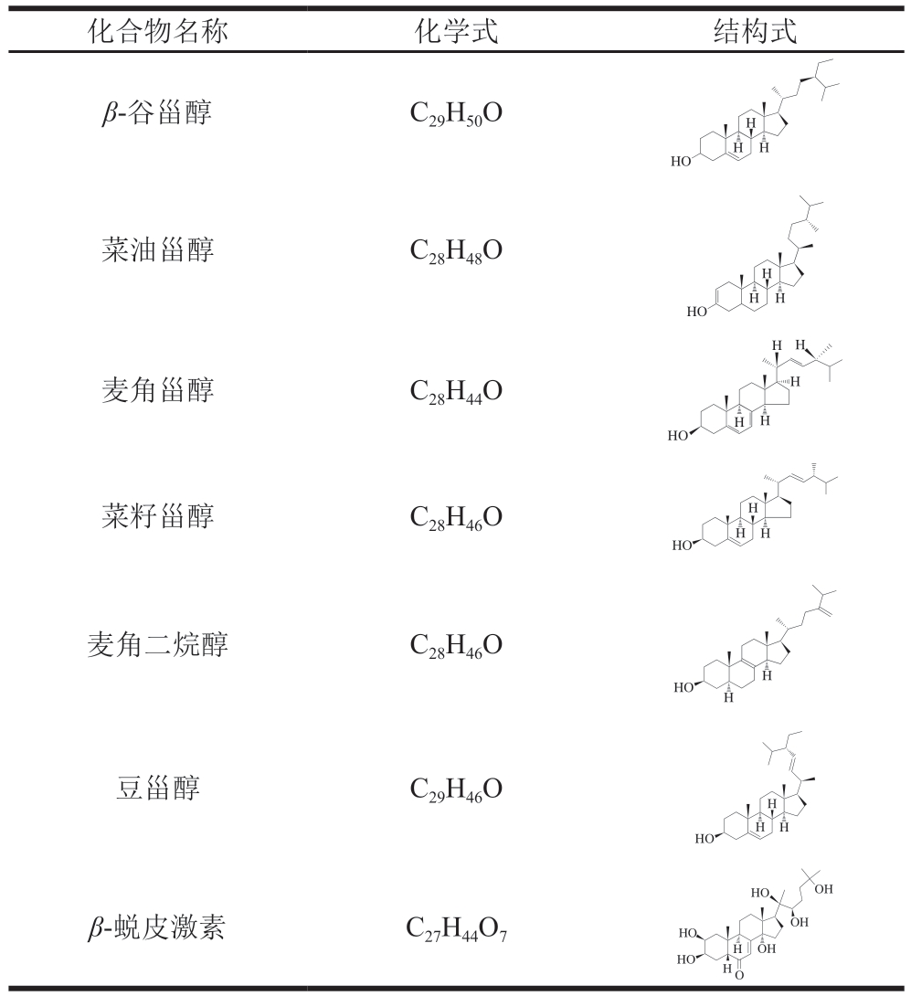 甾醇作为玛咖重要的次生代谢产物,主要存在于它的根、茎、叶中,与玛咖的保健功效紧密相关。玛咖甾醇主要包括β-谷甾醇、菜油甾醇、麦角固醇、菜籽甾醇和麦角二烯[54],其化学结构见表4[42]。