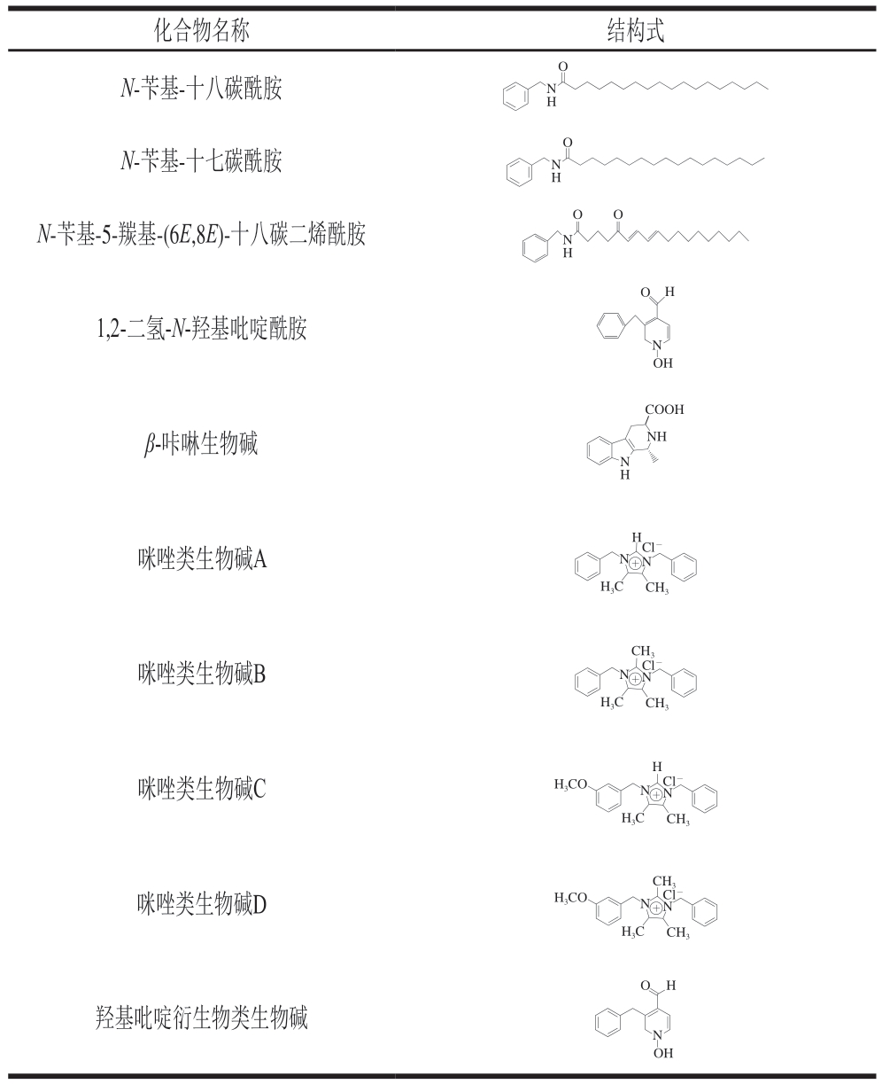 生物碱是一类含氮有机物,是玛咖中的一种次级代谢产物[26],主要包括玛咖酰胺、β-咔啉生物碱、咪唑生物碱[27]以及羟基吡啶衍生物类生物碱[28]等,其中玛咖酰胺是仅在玛咖中发现的特征物质。玛咖生物碱的化学结构见表2[29-31]。