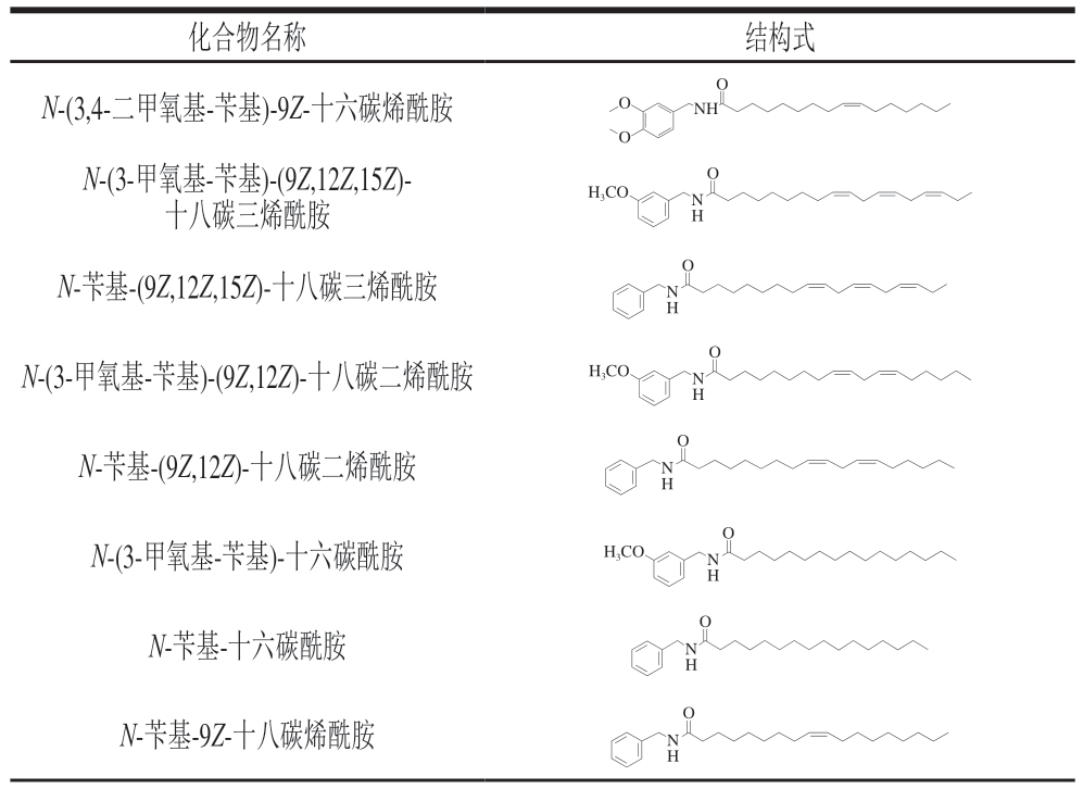 化合物名称 结构式N-(3,4-二甲氧基-苄基)-9Z-十六碳烯酰胺O O O NH N-(3-甲氧基-苄基)-(9Z,12Z,15Z)-十八碳三烯酰胺NH O H3CO O N-苄基-(9Z,12Z,15Z)-十八碳三烯酰胺 N H O H3CO N-(3-甲氧基-苄基)-(9Z,12Z)-十八碳二烯酰胺 N H O N-苄基-(9Z,12Z)-十八碳二烯酰胺 N H O H3CO N-(3-甲氧基-苄基)-十六碳酰胺NH O N-苄基-十六碳酰胺NH O N-苄基-9Z-十八碳烯酰胺 N H