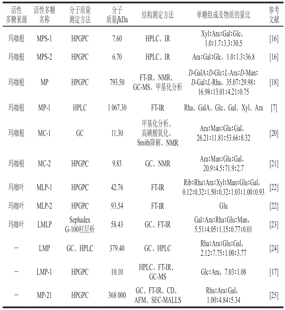 注:-.未知;LMLP.玛咖叶多糖(polysaccharide from Lepidium meyenii leaves);MLP.玛咖叶多糖(polysaccharides from the leaves of Maca);MC.玛咖根多糖(polysaccharide from Lepidium meyenii roots);FT-IR.傅里叶变换红外光谱(Fourier transform infrared spectrometer);CD.圆二色谱(circular dichroism);AFM.原子力显微镜(atomic force microscopy);SEC-MALLS.尺寸排阻色谱法与多角度激光光散射法联用(size exclusion chromatography coupled with multi-angle laser light scattering);MS.质谱(mass spectrum)。