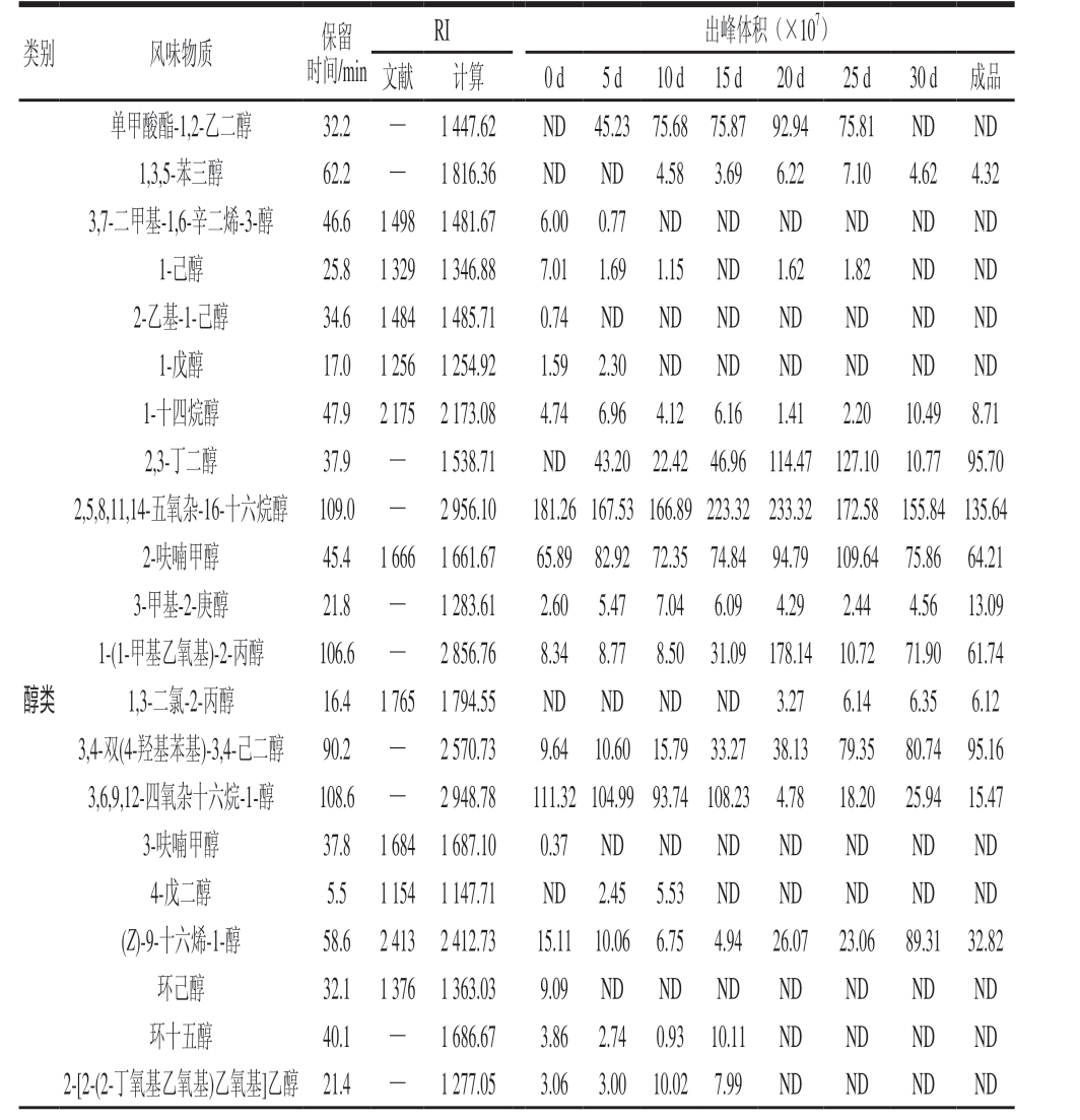 RI 出峰体积(×107)文献 计算 0 d 5 d 10 d 15 d 20 d 25 d 30 d 成品单甲酸酯-1,2-乙二醇 32.2 — 1 447.62 ND 45.23 75.68 75.87 92.94 75.81 ND ND 1,3,5-苯三醇 62.2 — 1 816.36 ND ND 4.58 3.69 6.22 7.10 4.62 4.32 3,7-二甲基-1,6-辛二烯-3-醇 46.6 1 498 1 481.67 6.00 0.77 ND ND ND ND ND ND 1-己醇 25.8 1 329 1 346.88 7.01 1.69 1.15 ND 1.62 1.82 ND ND 2-乙基-1-己醇 34.6 1 484 1 485.71 0.74 ND ND ND ND ND ND ND 1-戊醇 17.0 1 256 1 254.92 1.59 2.30 ND ND ND ND ND ND 1-十四烷醇 47.9 2 175 2 173.08 4.74 6.96 4.12 6.16 1.41 2.20 10.49 8.71 2,3-丁二醇 37.9 — 1 538.71 ND 43.20 22.42 46.96 114.47 127.10 10.77 95.70 2,5,8,11,14-五氧杂-16-十六烷醇 109.0 — 2 956.10 181.26 167.53 166.89 223.32 233.32 172.58 155.84 135.64 2-呋喃甲醇 45.4 1 666 1 661.67 65.89 82.92 72.35 74.84 94.79 109.64 75.86 64.21 3-甲基-2-庚醇 21.8 — 1 283.61 2.60 5.47 7.04 6.09 4.29 2.44 4.56 13.09 1-(1-甲基乙氧基)-2-丙醇 106.6 — 2 856.76 8.34 8.77 8.50 31.09 178.14 10.72 71.90 61.74醇类 1,3-二氯-2-丙醇 16.4 1 765 1 794.55 ND ND ND ND 3.27 6.14 6.35 6.12 3,4-双(4-羟基苯基)-3,4-己二醇 90.2 — 2 570.73 9.64 10.60 15.79 33.27 38.13 79.35 80.74 95.16 3,6,9,12-四氧杂十六烷-1-醇 108.6 — 2 948.78 111.32 104.99 93.74 108.23 4.78 18.20 25.94 15.47 3-呋喃甲醇 37.8 1 684 1 687.10 0.37 ND ND ND ND ND ND ND 4-戊二醇 5.5 1 154 1 147.71 ND 2.45 5.53 ND ND ND ND ND(Z)-9-十六烯-1-醇 58.6 2 413 2 412.73 15.11 10.06 6.75 4.94 26.07 23.06 89.31 32.82环己醇 32.1 1 376 1 363.03 9.09 ND ND ND ND ND ND ND环十五醇 40.1 — 1 686.67 3.86 2.74 0.93 10.11 ND ND ND ND 2-[2-(2-丁氧基乙氧基)乙氧基]乙醇 21.4 — 1 277.05 3.06 3.00 10.02 7.99 ND ND ND ND类别 风味物质 保留时间/min