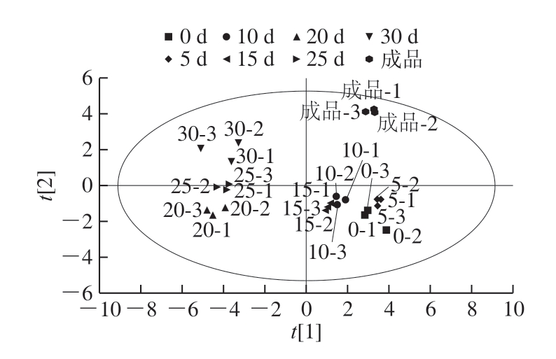 PCA将原始变量重新组合成一组新的独立综合变量,同时根据实际需要提取较少的变量,尽可能地反映原始变量[24]。鱼露挥发性化合物通过HS-SPME-GC×GCMS检测得到的数据,通过SIMCA软件进行PCA,结果如图3所示。在发酵的0~15 d,PCA中样品聚集在一起,说明在发酵的前15 d,样品中的挥发性风味物质成分比较接近。到第20天时,样品与第15天时可以明显地区分开,说明发酵到第20天时鱼露的风味已经发生改变,到后期鱼露样品的挥发性风味化合物都能够区分开,说明鱼露风味化合物在后期发酵过程中不断地发生改变,通过后期不断地发酵才形成了鱼露独特的风味口感。