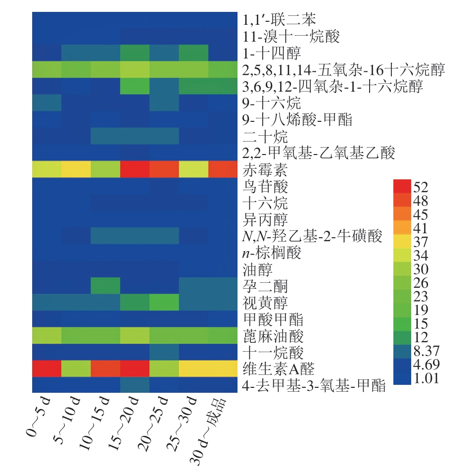 发酵过程为挥发性风味物质的形成提供了丰富的酶和各种前体物质,如碳水化合物、游离氨基酸和脂肪酸等[23]。为了进一步研究在发酵过程中挥发性风味化合物的变化,本研究选取在发酵过程中检测到的含量变化较为突出的23 种化合物,对含量的变化进行聚类分析,结果如图2所示,维生素A醛、赤霉素、蓖麻油酸、2,5,8,11,14-五氧杂-16-十六烷醇这4 种化合物在发酵过程中含量的变化始终比较明显,可能是这4 种化合物对鱼露的风味有着重要的影响。维生素A醛在发酵前期变化最大,到发酵后期变化稍有减慢,但总体增加还是比较大的。赤霉素在发酵的后期含量变化最大,在发酵前期含量不断增加,但增加的速度可能稍慢于后期。蓖麻油酸和2,5,8,11,14-五氧杂-16-十六烷醇在整个发酵过程中的含量不断增加,通过对比发现,在发酵过程中增加的速度变化较小。其他化合物在发酵过程中的含量也在不断增加,但可能增加的速度与这4 种化合物相比较为缓慢。