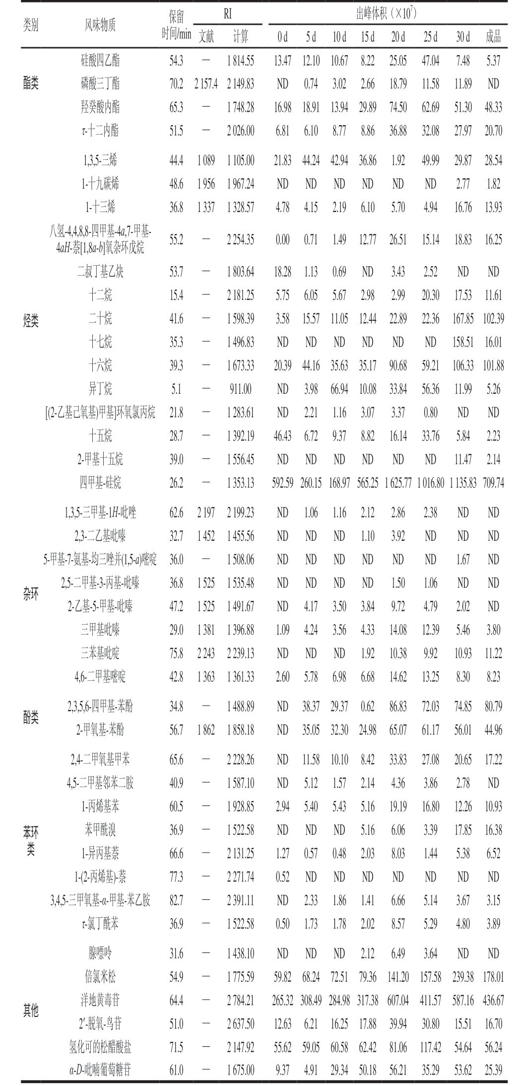 RI 出峰体积(×107)文献 计算 0 d 5 d 10 d 15 d 20 d 25 d 30 d 成品硅酸四乙酯 54.3 — 1 814.55 13.47 12.10 10.67 8.22 25.05 47.04 7.48 5.37酯类 磷酸三丁酯 70.2 2 157.4 2 149.83 ND 0.74 3.02 2.66 18.79 11.58 11.89 ND羟癸酸内酯 65.3 — 1 748.28 16.98 18.91 13.94 29.89 74.50 62.69 51.30 48.33 τ-十二内酯 51.5 — 2 026.00 6.81 6.10 8.77 8.86 36.88 32.08 27.97 20.70类别 风味物质 保留时间/min 1,3,5-三烯 44.4 1 089 1 105.00 21.83 44.24 42.94 36.86 1.92 49.99 29.87 28.54 1-十九碳烯 48.6 1 956 1 967.24 ND ND ND ND ND ND 2.77 1.82 1-十三烯 36.8 1 337 1 328.57 4.78 4.15 2.19 6.10 5.70 4.94 16.76 13.93八氢-4,4,8,8-四甲基-4a,7-甲基-4aH-萘[1,8a-b]氧杂环戊烷 55.2 — 2 254.35 0.00 0.71 1.49 12.77 26.51 15.14 18.83 16.25烃类二叔丁基乙炔 53.7 — 1 803.64 18.28 1.13 0.69 ND 3.43 2.52 ND ND十二烷 15.4 — 2 181.25 5.75 6.05 5.67 2.98 2.99 20.30 17.53 11.61二十烷 41.6 — 1 598.39 3.58 15.57 11.05 12.44 22.89 22.36 167.85 102.39十七烷 35.3 — 1 496.83 ND ND ND ND ND ND 158.51 16.01十六烷 39.3 — 1 673.33 20.39 44.16 35.63 35.17 90.68 59.21 106.33 101.88异丁烷 5.1 — 911.00 ND 3.98 66.94 10.08 33.84 56.36 11.99 5.26[(2-乙基己氧基)甲基]环氧氯丙烷 21.8 — 1 283.61 ND 2.21 1.16 3.07 3.37 0.80 ND ND十五烷 28.7 — 1 392.19 46.43 6.72 9.37 8.82 16.14 33.76 5.84 2.23 2-甲基十五烷 39.0 — 1 556.45 ND ND ND ND ND ND 11.47 2.14四甲基-硅烷 26.2 — 1 353.13 592.59 260.15 168.97 565.25 1 625.77 1 016.80 1 135.83 709.74杂环1,3,5-三甲基-1H-吡唑 62.6 2 197 2 199.23 ND 1.06 1.16 2.12 2.86 2.38 ND ND 2,3-二乙基吡嗪 32.7 1 452 1 455.56 ND ND ND 1.10 3.92 ND ND ND 5-甲基-7-氨基-均三唑并(1,5-a)嘧啶 36.0 — 1 508.06 ND ND ND ND ND ND 1.67 ND 2,5-二甲基-3-丙基-吡嗪 36.8 1 525 1 535.48 ND ND ND ND 1.50 1.06 ND ND 2-乙基-5-甲基-吡嗪 47.2 1 525 1 491.67 ND 4.17 3.50 3.84 9.72 4.79 2.02 ND三甲基吡嗪 29.0 1 381 1 396.88 1.09 4.24 3.56 4.33 14.08 12.39 5.46 3.80三苯基吡啶 75.8 2 243 2 239.13 ND ND ND 1.92 10.38 9.92 10.93 11.22 4,6-二甲基嘧啶 42.8 1 363 1 361.33 2.60 5.78 6.98 6.68 14.62 13.25 8.30 8.23酚类2,3,5,6-四甲基-苯酚 34.8 — 1 488.89 ND 38.37 29.37 0.62 86.83 72.03 74.85 80.79 2-甲氧基-苯酚 56.7 1 862 1 858.18 ND 35.05 32.30 24.98 65.07 61.17 56.01 44.96苯环类2,4-二甲氧基甲苯 65.6 — 2 228.26 ND 11.58 10.10 8.42 33.83 27.08 20.65 17.22 4,5-二甲基邻苯二胺 40.9 — 1 587.10 ND 5.12 1.57 2.14 4.36 3.86 2.78 ND 1-丙烯基苯 60.5 — 1 928.85 2.94 5.40 5.43 5.16 19.19 16.80 12.26 10.93苯甲酰溴 36.9 — 1 522.58 ND ND ND 5.16 6.06 3.39 17.85 16.38 1-异丙基萘 66.6 — 2 131.25 1.27 0.57 0.48 2.03 8.03 1.44 5.38 6.52 1-(2-丙烯基)-萘 77.3 — 2 271.74 0.52 ND ND ND ND ND ND ND 3,4,5-三甲氧基-α-甲基-苯乙胺 82.7 — 2 391.11 ND 2.33 1.86 1.41 6.66 5.14 3.67 3.15 τ-氯丁酰苯 36.9 — 1 522.58 0.50 1.73 1.78 2.02 8.57 5.29 4.80 3.89其他腺嘌呤 31.6 — 1 438.10 ND ND ND 2.12 6.49 3.64 ND ND倍氯米松 54.9 — 1 775.59 59.82 68.24 72.51 79.36 141.20 157.58 239.38 178.01洋地黄毒苷 64.4 — 2 784.21 265.32 308.49 284.98 317.38 607.04 411.57 587.16 436.67 2’-脱氧-鸟苷 51.0 — 2 637.50 12.63 6.21 16.25 17.88 39.94 30.80 15.51 16.70氢化可的松醋酸盐 71.5 — 2 147.92 55.62 59.05 60.58 62.42 81.06 117.42 54.64 56.24 α-D-吡喃葡萄糖苷 61.0 — 1 675.00 9.37 4.91 29.34 50.18 56.21 35.29 53.62 25.39