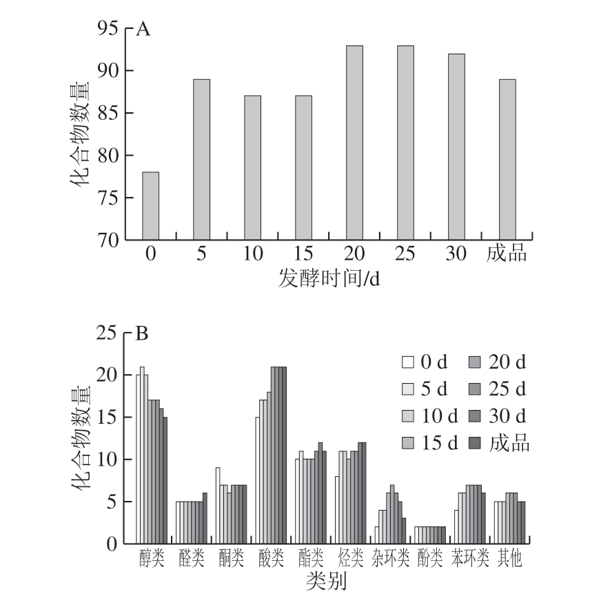随着发酵时间的延长,检测到的化合物种类不断增加,当发酵到第20、25天时,检测到的化合物种类最多为93 种;发酵第25天时,检测到醇类17 种(9.09%)、醛类5 种(6.79%)、酮类7 种(2.37%)、酸类21 种(16.48%)、酯类11 种(36.34%)、烃类11 种(16.29%)、酚类2 种(1.69%)、杂环类6 种(0.56%)、苯环类7 种(0.80%)和6 种其他类化合物(9.61%)。在发酵前期,酮类、酸类和酯类化合物占比不断增加,其中酯类化合物占比增加最快,在酯类化合物中泼尼松龙醋酸酯(25.72%)、赤霉素(5.23%)等挥发性物质的含量较高。