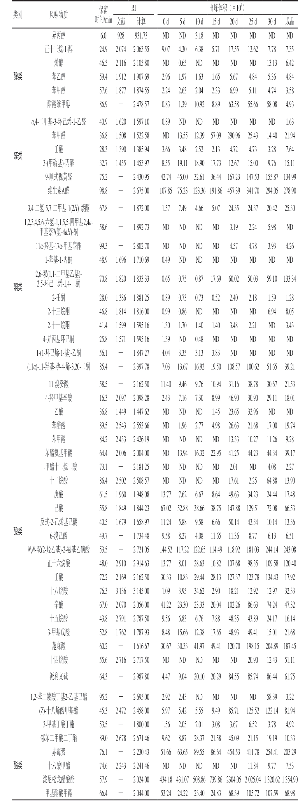 RI 出峰体积(×107)文献 计算 0 d 5 d 10 d 15 d 20 d 25 d 30 d 成品异丙醇 6.0 928 931.73 ND ND 3.18 ND ND ND ND ND正十三烷-1-醇 24.9 2 074 2 063.55 9.07 4.30 6.38 5.71 17.55 13.62 7.78 7.35烯醇 46.5 2 116 2 105.80 ND 0.65 ND ND ND ND 13.13 6.42醇类 苯乙醇 59.4 1 912 1 907.69 2.96 1.97 1.63 1.65 5.67 4.84 5.36 4.84苯甲醇 57.6 1 877 1 874.55 2.24 2.63 2.04 2.33 6.99 5.11 4.74 3.58醋酸维甲醇 86.9 — 2 478.57 0.83 1.39 10.92 8.89 63.58 55.66 58.08 4.93类别 风味物质 保留时间/min醛类α,4-二甲基-3-环己烯-1-乙醛 40.9 1 620 1 597.10 0.89 ND ND ND ND ND ND 1.63苯甲醛 36.8 1 508 1 522.58 ND 13.55 12.39 57.09 290.96 25.43 14.40 21.94壬醛 28.3 1 390 1 385.94 3.66 3.48 2.52 2.13 4.72 4.73 3.28 7.64 3-(甲硫基)-丙醛 32.7 1 455 1 453.97 8.55 19.11 18.90 17.73 12.67 15.00 9.76 15.11 9-顺式视黄醛 75.2 — 2 430.95 42.74 45.00 32.61 36.44 167.23 147.53 155.87 134.99维生素A醛 98.8 — 2 675.00 107.85 75.23 123.36 191.86 457.39 341.70 294.05 278.90 3,4-二氢-5,7-二甲基-1(2H)-萘酮 67.8 — 1 872.00 1.57 7.49 4.66 5.07 24.35 24.37 20.42 25.30 1,2,3,4,5,6-六氢-1,1,5,5-四甲基2,4a-甲基萘7(氢-4aH)-酮 58.6 — 1 892.73 ND ND ND ND 3.19 2.24 5.98 ND酮类11α-羟基-17α-甲基睾酮 99.3 — 2 802.70 ND ND ND ND 4.57 4.78 3.93 4.26 1-苯基-1-丙酮 48.9 1 696 1 710.69 0.49 ND ND ND ND ND ND ND 2,6-双(1,1-二甲基乙基)-2,5-环己二烯-1,4-二酮 70.8 1 820 1 833.33 0.65 0.75 0.87 17.69 60.02 50.03 59.10 133.34 2-壬酮 28.0 1 386 1 881.25 0.89 0.73 0.73 0.52 2.40 2.18 1.59 1.28 2-十三烷酮 46.8 1 814 1 816.00 0.99 0.86 ND ND ND ND 6.94 8.05 2-十一烷酮 41.4 1 599 1 595.16 1.30 1.70 1.40 1.40 3.48 2.21 ND 3.43 4-异丙基环己酮 25.8 1 571 1 595.16 1.39 ND 0.48 ND ND ND ND ND 1-(1-环己烯-1-基)-乙酮 56.1 — 1 847.27 4.04 3.35 3.13 3.83 ND ND ND ND(11α)-11-羟基-孕-4-烯-3,20-二酮 85.4 — 2 397.78 7.03 13.67 16.92 19.50 108.57 100.62 51.65 39.21 11-溴癸酸 58.5 — 2 162.50 11.40 9.46 9.76 10.94 31.16 38.78 30.67 21.53 4-羟甲基辛酸 16.3 2 097 2 098.28 2.43 7.16 7.30 8.99 46.90 30.90 29.11 18.01乙酸 36.8 1 449 1 447.62 ND ND ND 1.45 23.65 32.96 ND ND苯醋酸 89.5 2 543 2 553.66 ND 1.96 2.77 4.98 26.63 21.68 17.00 19.74苯甲酸 84.2 2 433 2 426.19 ND ND ND ND 13.33 10.27 11.26 9.28苯酯氨基甲酸 64.4 2 006 2 004.00 ND 13.94 16.32 22.95 41.25 44.23 44.34 39.17二甲酯十二烷二酸 73.1 — 2 181.25 ND ND ND ND 2.01 ND 4.08 2.27十二烷酸 86.4 2 502 2 508.57 ND ND ND ND 17.61 2.25 64.88 13.90庚酸 61.5 1 960 1 948.08 13.77 7.62 6.67 8.64 49.63 34.23 24.44 17.48己酸 55.8 1 849 1 844.23 67.02 52.88 38.66 38.75 147.88 129.51 72.08 66.53反式-2-己烯基己酸 40.5 1 679 1 658.97 11.24 5.88 9.58 6.66 50.14 43.34 10.14 13.36 6-溴己酸 49.7 — 1 734.48 9.58 8.27 4.08 11.65 11.36 8.77 6.13 6.51 N,N-双(2-羟乙基)-2-氨基乙磺酸 53.5 — 2 721.05 144.52 117.22 122.65 114.49 118.92 181.03 244.14 243.08正十六烷酸 48.0 2 910 2 914.63 13.77 8.01 28.63 10.82 107.68 98.35 109.58 120.40壬酸 72.2 2 169 2 162.50 30.33 10.83 29.44 28.13 127.37 123.78 134.43 17.92十八烷酸 76.3 3 136 3 145.00 1.09 3.95 34.62 2.90 18.21 12.92 12.97 32.33辛酸 67.0 2 070 2 056.00 41.22 23.30 23.33 20.04 102.26 86.63 74.24 47.32十五烷酸 43.8 2 791 2 787.50 9.56 6.83 6.76 7.88 48.35 43.89 24.17 16.14 3-甲基戊酸 52.8 1 762 1 787.93 8.48 15.66 12.38 17.65 48.93 49.41 15.01 21.68蓖麻酸 60.2 — 1 616.67 30.67 30.33 41.97 49.41 120.70 198.15 204.89 187.45十四烷酸 55.6 2 716 2 717.50 ND ND ND ND ND 20.90 12.43 51.11派利文碱 64.3 — 2 987.80 4.47 9.04 20.10 20.29 84.55 85.74 86.44 61.75酸类1,2-苯二羧酸丁基2-乙基己酯 95.2 — 2 695.00 2.92 2.43 ND ND ND ND 58.39 3.22(Z)-十八烯酸甲基酯 45.3 2 472 2 458.00 5.97 5.42 5.55 9.49 85.71 125.52 122.14 81.94 3-甲基丁酸丁酯 53.5 — 1 800.00 1.56 2.05 2.01 3.08 3.67 6.52 3.78 4.92邻苯二甲酸二丁酯 89.0 2 678 2 671.46 9.62 8.87 28.37 21.58 45.09 21.15 19.19 10.33赤霉素 76.1 — 2 230.43 51.66 63.65 89.55 86.64 454.53 411.78 254.41 203.29酯类 十六酸甲酯 74.6 2 243 2 241.46 ND ND ND ND ND 11.84 9.77 7.53泼尼松龙醋酸酯 57.9 — 2 024.00 434.18 431.07 508.86 739.86 2304.05 2 025.04 1 320.62 1 354.90甲基酯酸甲酯 66.4 — 2 044.00 53.24 24.22 23.40 24.83 68.39 105.72 107.59 68.98