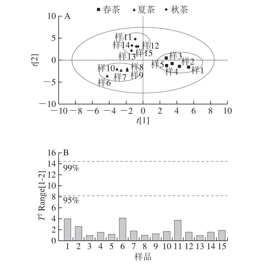 Fig. 3 PLS-DA score plot (A) and Hotelling T2 distribution plot (B)