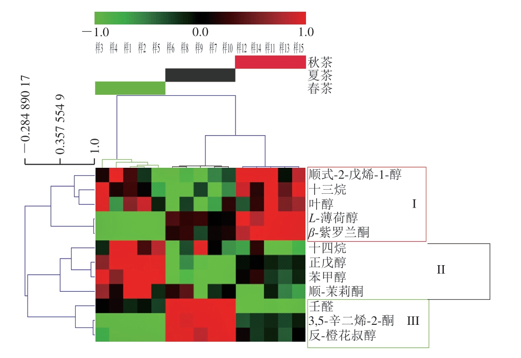 为直观了解12 种关键香气成分分别在3 季凌云白毫绿茶中含量的分布,通过绘制热图,并采用层次聚类分析法对12 种香气成分进行聚类。结果表明,L-薄荷醇和β-紫罗兰酮在秋茶中相对含量最高,是凌云白毫秋茶区别于春茶和夏茶的特征香气成分,这2 种香气成分主要表现为花香、果香、薄荷味,而且在秋茶中表现的气味更加浓郁,即对秋茶的综合香气贡献更大;苯甲醇和正戊醇在春茶中相对含量较高,是春茶区别于夏茶和秋茶的特征香气成分,主要表现为果香、杏仁苦味,而且在春茶中表现的气味更加浓郁,在春茶的综合香气中贡献相对较大;壬醛、3,5-辛二烯-2-酮、反-橙花叔醇在夏茶中相对含量最高,是夏茶区别于春茶和秋茶的特征香气成分,香气主要为柑橘柠檬香、水果甜香,而且在夏茶中表现的气味更加浓郁,对夏茶的综合香气贡献更大。这与Kang等[16]表明的绿茶春茶中苯甲醇含量显著较高,且夏茶中醛酮化合物含量较高的结果相近。