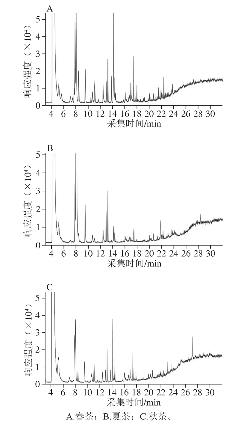 通过动态顶空-气相色谱-质谱,利用全扫描模式对各样品的香气成分进行测定,得到各季节的总离子流图。结合NIST谱库和前人的相关研究,对不同季节茶叶中各香气成分进行鉴定,筛选匹配度达到90%以上的化合物,同时结合化合物结构,排除柱流失等干扰性化合物。根据峰面积归一法得到各香气成分的相对含量。