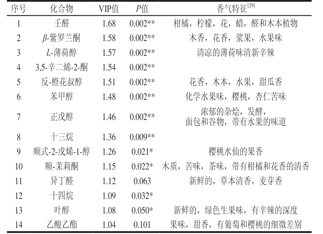 表2 PLS-DA模型中VIP值大于1的化合物P值及其香气特征