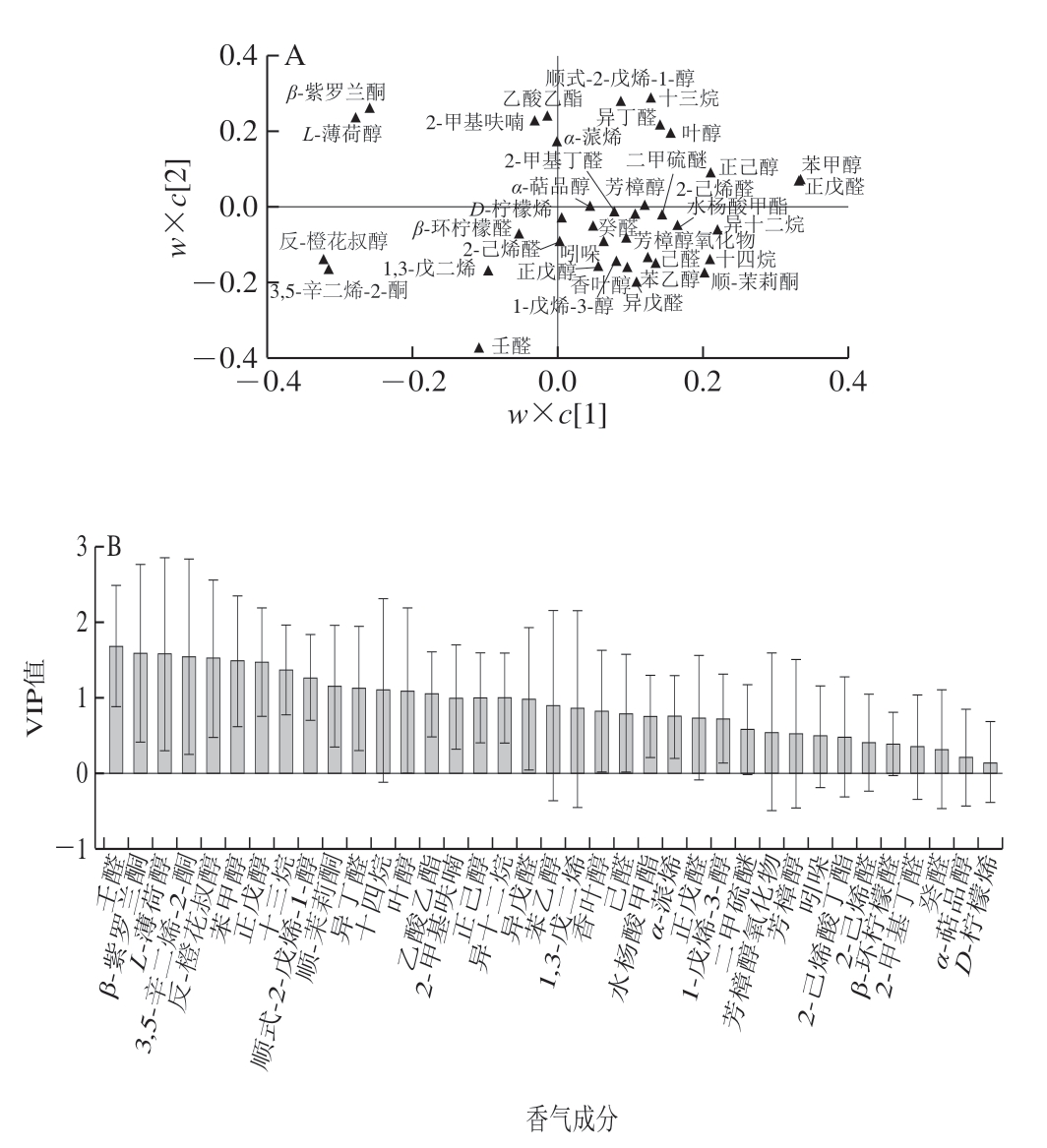 图5 PLS-DA模型因子载荷图(A)和37 种香气成分VIP值图(B)