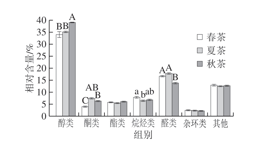 图2 不同季节茶叶香气成分中各类化合物相对含量差异