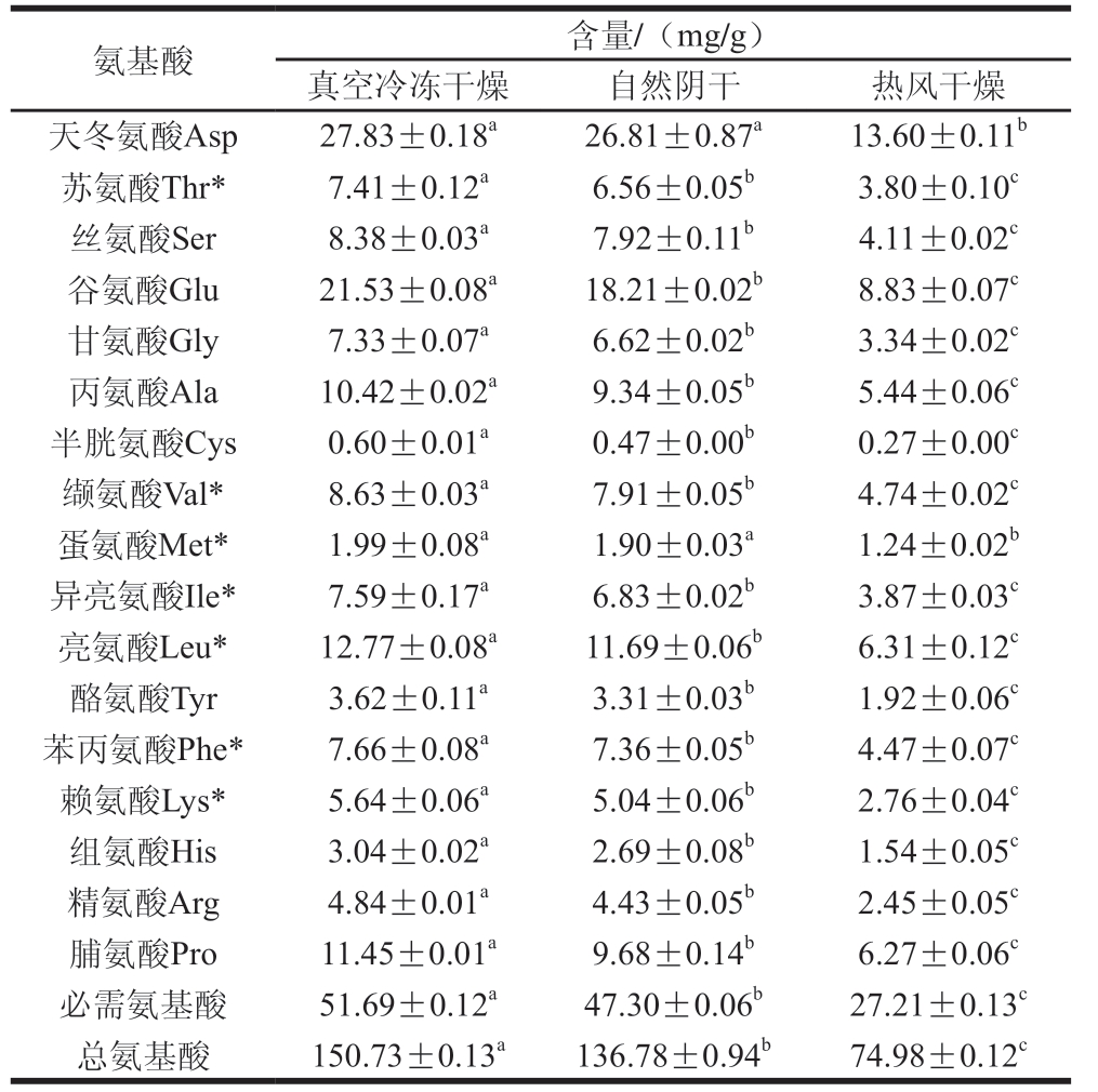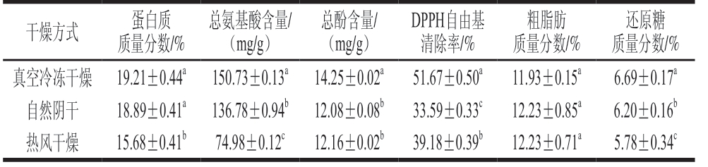 还原糖质量分数/%真空冷冻干燥 19.21±0.44a 150.73±0.13a 14.25±0.02a 51.67±0.50a 11.93±0.15a 6.69±0.17a自然阴干 18.89±0.41a 136.78±0.94b 12.08±0.08b 33.59±0.33c 12.23±0.85a 6.20±0.16b热风干燥 15.68±0.41b 74.98±0.12c 12.16±0.02b 39.18±0.39b 12.23±0.71a 5.78±0.34c干燥方式 蛋白质质量分数/%总氨基酸含量/(mg/g)总酚含量/(mg/g)DPPH自由基清除率/%粗脂肪质量分数/%