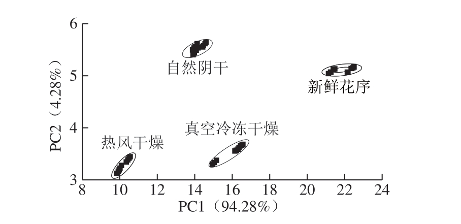 PCA累计贡献率越大,越能反映样品的信息,样品间坐标上距离越大,则差异越大[30]。通过PCA图可以判定电子鼻是否能区分不同干燥方式处理下沙枣花的香气。从图2可以看出,第1主成分贡献率为94.28%,第2主成分贡献率为4.28%,总贡献率为98.56%,表明2 个主成分能够反映原始数据的信息。且不同样品在PCA图中的分布呈现明显区别,其中新鲜花序与各干燥样品在横轴坐标上均有差异性,说明干燥处理改变了沙枣花挥发性风味物质。真空冷冻干燥与新鲜花序在第1主成分上距离最近,自然阴干与新鲜花序在第2主成分上距离最近,说明真空冷冻干燥和自然阴干的挥发性风味成分与新鲜花序更为接近。而热风干燥与其他干燥处理的样品在第1主成分上距离较大,说明热风干燥样品的挥发性物质与新鲜花序及其他干燥处理的样品差异较大。自然阴干与真空冷冻干燥样品虽然在第1主成分上距离较近,但在第2主成分上则完全可以分开。总体来看,利用PCA使新鲜花序及各干样均能被较好地区分开,可以达到区分不同沙枣花样品的目的。