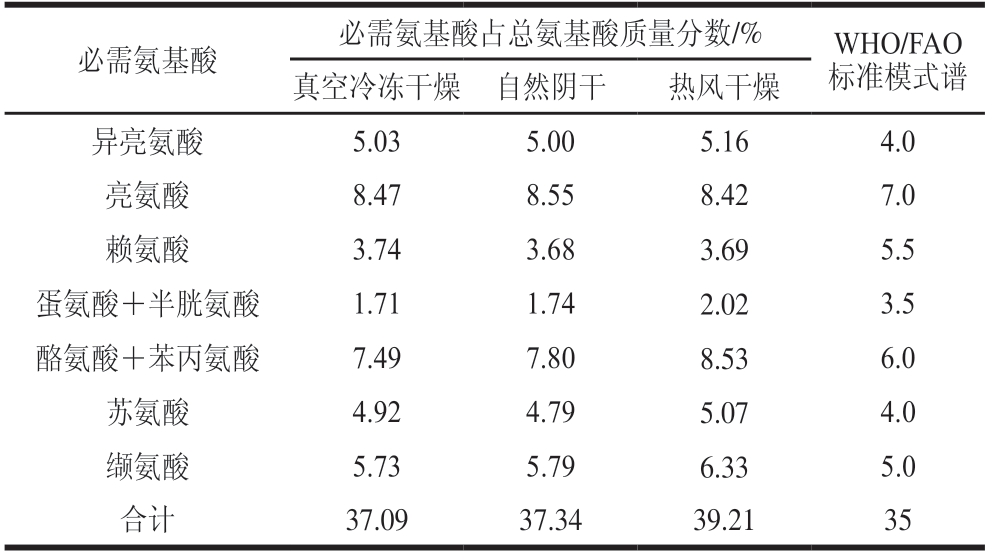 必需氨基酸 必需氨基酸占总氨基酸质量分数/% WHO/FAO标准模式谱真空冷冻干燥 自然阴干 热风干燥异亮氨酸 5.03 5.00 5.16 4.0亮氨酸 8.47 8.55 8.42 7.0赖氨酸 3.74 3.68 3.69 5.5蛋氨酸+半胱氨酸 1.71 1.74 2.02 3.5酪氨酸+苯丙氨酸 7.49 7.80 8.53 6.0苏氨酸 4.92 4.79 5.07 4.0缬氨酸 5.73 5.79 6.33 5.0合计 37.09 37.34 39.21 35