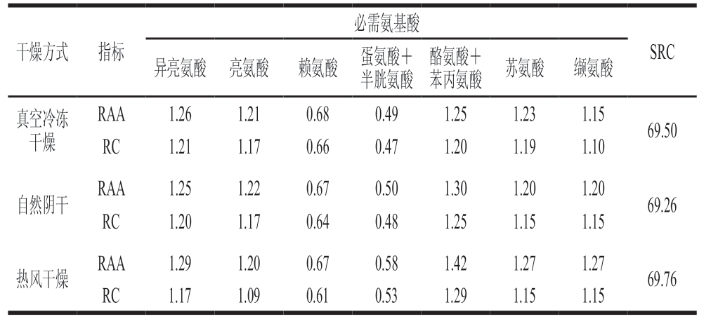 必需氨基酸干燥方式 指标SRC异亮氨酸 亮氨酸 赖氨酸 蛋氨酸+半胱氨酸酪氨酸+苯丙氨酸 苏氨酸 缬氨酸真空冷冻干燥RAA 1.26 1.21 0.68 0.49 1.25 1.23 1.15 69.50 RC 1.21 1.17 0.66 0.47 1.20 1.19 1.10 RAA 1.25 1.22 0.67 0.50 1.30 1.20 1.20 69.26 RC 1.20 1.17 0.64 0.48 1.25 1.15 1.15热风干燥 RAA 1.29 1.20 0.67 0.58 1.42 1.27 1.27 69.76 RC 1.17 1.09 0.61 0.53 1.29 1.15 1.15自然阴干