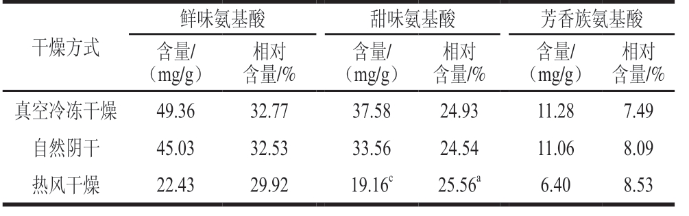 干燥方式鲜味氨基酸 甜味氨基酸 芳香族氨基酸含量/(mg/g)相对含量/%真空冷冻干燥 49.36 32.77 37.58 24.93 11.28 7.49自然阴干 45.03 32.53 33.56 24.54 11.06 8.09热风干燥 22.43 29.92 19.16c 25.56a 6.40 8.53相对含量/%含量/(mg/g)相对含量/%含量/(mg/g)
