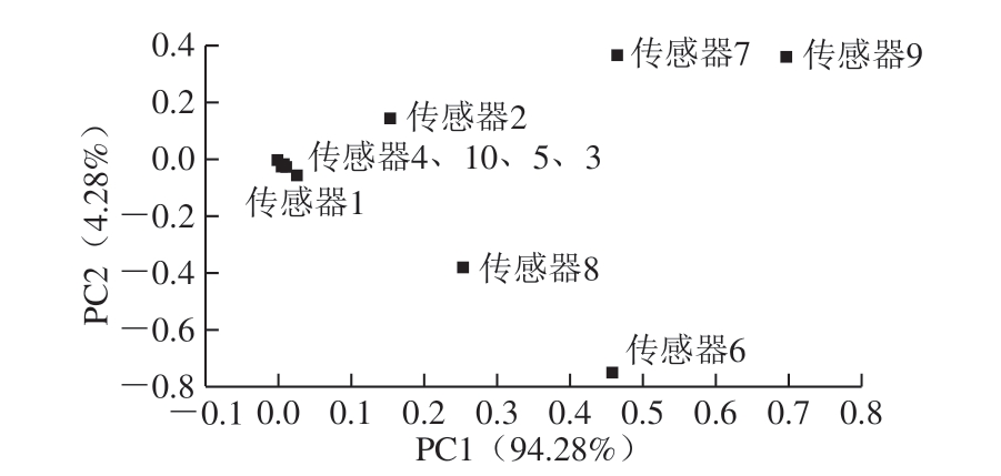电子鼻数据分析:运用Winmuster软件对数据进行主成分分析(principal component analysis,PCA)与传感器贡献率分析。
