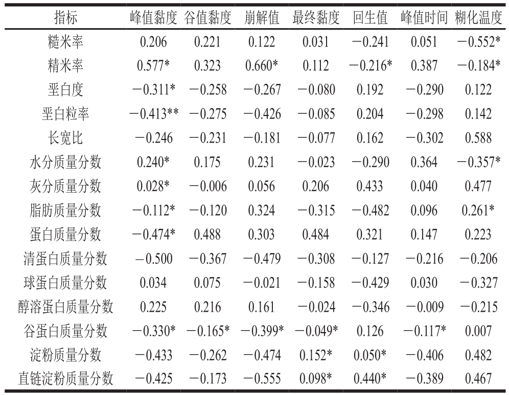 指标 峰值黏度 谷值黏度 崩解值 最终黏度 回生值 峰值时间 糊化温度糙米率 0.206 0.221 0.122 0.031 -0.241 0.051 -0.552*精米率 0.577* 0.323 0.660* 0.112 -0.216* 0.387 -0.184*垩白度 -0.311* -0.258 -0.267 -0.080 0.192 -0.290 0.122垩白粒率 -0.413**-0.275 -0.426 -0.085 0.204 -0.298 0.142长宽比 -0.246 -0.231 -0.181 -0.077 0.162 -0.302 0.588水分质量分数 0.240* 0.175 0.231 -0.023 -0.290 0.364 -0.357*灰分质量分数 0.028* -0.006 0.056 0.206 0.433 0.040 0.477脂肪质量分数 -0.112* -0.120 0.324 -0.315 -0.482 0.096 0.261*蛋白质量分数 -0.474* 0.488 0.303 0.484 0.321 0.147 0.223清蛋白质量分数 -0.500 -0.367 -0.479 -0.308 -0.127 -0.216 -0.206球蛋白质量分数 0.034 0.075 -0.021 -0.158 -0.429 0.030 -0.327醇溶蛋白质量分数 0.225 0.216 0.161 -0.024 -0.346 -0.009 -0.215谷蛋白质量分数 -0.330*-0.165*-0.399*-0.049* 0.126 -0.117* 0.007淀粉质量分数 -0.433 -0.262 -0.474 0.152* 0.050* -0.406 0.482直链淀粉质量分数 -0.425 -0.173 -0.555 0.098* 0.440* -0.389 0.467