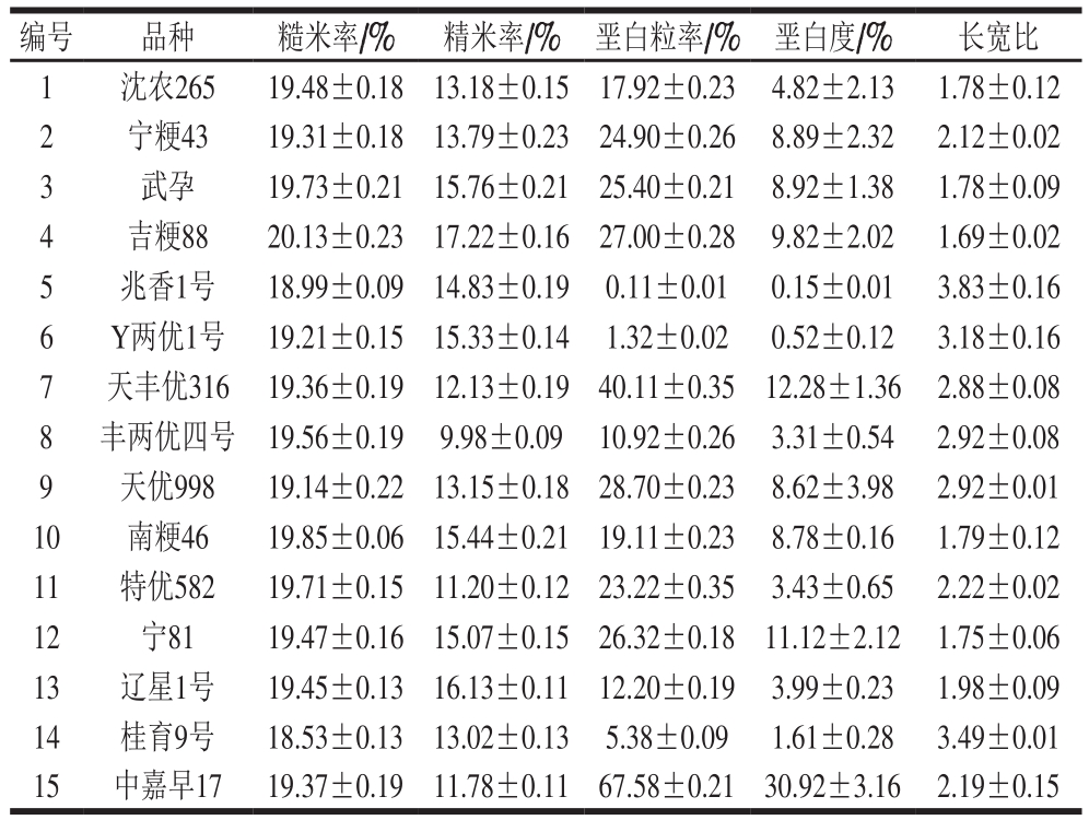 编号 品种 糙米率/% 精米率/% 垩白粒率/% 垩白度/% 长宽比1 沈农265 19.48±0.18 13.18±0.15 17.92±0.23 4.82±2.13 1.78±0.12 2 宁粳43 19.31±0.18 13.79±0.23 24.90±0.26 8.89±2.32 2.12±0.02 3 武孕 19.73±0.21 15.76±0.21 25.40±0.21 8.92±1.38 1.78±0.09 4 吉粳88 20.13±0.23 17.22±0.16 27.00±0.28 9.82±2.02 1.69±0.02 5 兆香1号 18.99±0.09 14.83±0.19 0.11±0.01 0.15±0.01 3.83±0.16 6 Y两优1号 19.21±0.15 15.33±0.14 1.32±0.02 0.52±0.12 3.18±0.16 7 天丰优316 19.36±0.19 12.13±0.19 40.11±0.35 12.28±1.36 2.88±0.08 8 丰两优四号 19.56±0.19 9.98±0.09 10.92±0.26 3.31±0.54 2.92±0.08 9 天优998 19.14±0.22 13.15±0.18 28.70±0.23 8.62±3.98 2.92±0.01 10 南粳46 19.85±0.06 15.44±0.21 19.11±0.23 8.78±0.16 1.79±0.12 11 特优582 19.71±0.15 11.20±0.12 23.22±0.35 3.43±0.65 2.22±0.02 12 宁81 19.47±0.16 15.07±0.15 26.32±0.18 11.12±2.12 1.75±0.06 13 辽星1号 19.45±0.13 16.13±0.11 12.20±0.19 3.99±0.23 1.98±0.09 14 桂育9号 18.53±0.13 13.02±0.13 5.38±0.09 1.61±0.28 3.49±0.01 15 中嘉早17 19.37±0.19 11.78±0.11 67.58±0.21 30.92±3.16 2.19±0.15