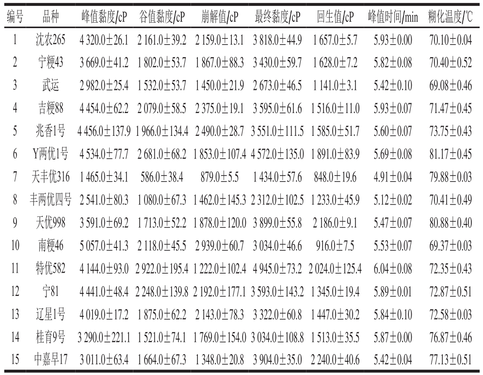 编号 品种 峰值黏度/cP 谷值黏度/cP 崩解值/cP 最终黏度/cP 回生值/cP 峰值时间/min 糊化温度/℃1 沈农265 4 320.0±26.12 161.0±39.22 159.0±13.13 818.0±44.9 1 657.0±5.7 5.93±0.00 70.10±0.04 2 宁粳43 3 669.0±41.21 802.0±53.71 867.0±88.33 430.0±59.7 1 628.0±7.2 5.82±0.08 70.40±0.52 3 武运 2 982.0±25.41 532.0±53.71 450.0±21.92 673.0±46.5 1 141.0±3.1 5.42±0.10 69.08±0.46 4 吉粳88 4 454.0±62.22 079.0±58.52 375.0±19.13 595.0±61.61 516.0±11.0 5.93±0.07 71.47±0.45 5 兆香1号 4 456.0±137.91 966.0±134.42 490.0±28.73 551.0±111.51 585.0±51.7 5.60±0.07 73.75±0.43 6 Y两优1号 4 534.0±77.72 681.0±68.21 853.0±107.44 572.0±135.01 891.0±83.9 5.69±0.08 81.17±0.45 7 天丰优316 1 465.0±34.1 586.0±38.4 879.0±5.5 1 434.0±57.6 848.0±19.6 4.91±0.04 79.88±0.03 8 丰两优四号 2 541.0±80.31 080.0±67.31 462.0±145.32 312.0±102.51 233.0±45.9 5.12±0.02 70.41±0.49 9 天优998 3 591.0±69.21 713.0±52.21 878.0±120.03 899.0±55.8 2 186.0±9.1 5.47±0.07 80.88±0.40 10 南粳46 5 057.0±41.32 118.0±45.52 939.0±60.73 034.0±46.6 916.0±7.5 5.53±0.07 69.37±0.03 11 特优582 4 144.0±93.02 922.0±195.41 222.0±102.44 945.0±73.22 024.0±125.4 6.04±0.08 72.35±0.43 12 宁81 4 441.0±48.42 248.0±139.82 192.0±177.13 593.0±143.21 345.0±19.4 5.89±0.01 72.87±0.51 13 辽星1号 4 019.0±17.21 875.0±62.22 143.0±78.33 322.0±60.81 447.0±30.2 5.84±0.10 72.58±0.03 14 桂育9号 3 290.0±221.11 521.0±74.11 769.0±154.03 034.0±108.81 513.0±35.5 5.87±0.00 76.87±0.46 15 中嘉早17 3 011.0±63.41 664.0±67.31 348.0±20.83 904.0±35.02 240.0±40.6 5.42±0.04 77.13±0.51
