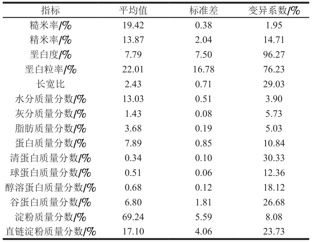 指标 平均值 标准差 变异系数/%糙米率/% 19.42 0.38 1.95精米率/% 13.87 2.04 14.71垩白度/% 7.79 7.50 96.27垩白粒率/% 22.01 16.78 76.23长宽比 2.43 0.71 29.03水分质量分数/% 13.03 0.51 3.90灰分质量分数/% 1.43 0.08 5.73脂肪质量分数/% 3.68 0.19 5.03蛋白质量分数/% 7.89 0.85 10.84清蛋白质量分数/% 0.34 0.10 30.33球蛋白质量分数/% 0.51 0.06 12.36醇溶蛋白质量分数/% 0.68 0.12 18.12谷蛋白质量分数/% 6.80 1.81 26.68淀粉质量分数/% 69.24 5.59 8.08直链淀粉质量分数/% 17.10 4.06 23.73