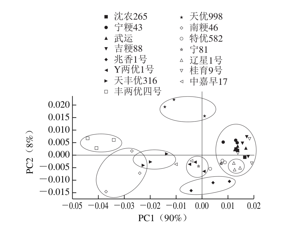 Fig.3 Principal component analysis of odor in cooked rice from different cultivars