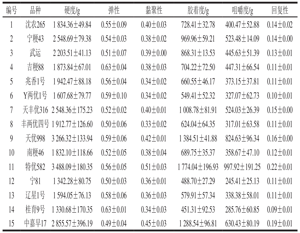 编号 品种 硬度/g 弹性 黏聚性 胶着度/g 咀嚼度/g 回复性1 沈农265 1 834.36±49.84 0.55±0.09 0.40±0.03 728.41±32.78 400.47±52.88 0.14±0.02 2 宁粳43 2 548.69±79.38 0.54±0.03 0.38±0.02 969.96±59.21 523.48±14.09 0.14±0.00 3 武运 2 203.51±41.13 0.51±0.07 0.39±0.00 868.31±13.53 445.63±51.39 0.13±0.01 4 吉粳88 1 873.84±67.01 0.63±0.04 0.38±0.03 704.22±72.50 447.31±66.54 0.11±0.01 5 兆香1号 1 942.47±88.18 0.56±0.04 0.34±0.02 660.55±46.17 373.15±37.81 0.11±0.01 6 Y两优1号 1 607.68±79.77 0.59±0.10 0.34±0.02 549.41±52.32 327.07±62.73 0.10±0.01 7 天丰优3162 548.36±175.23 0.52±0.02 0.40±0.01 1 008.78±81.91 524.03±26.39 0.15±0.00 8 丰两优四号 1 912.77±126.60 0.50±0.06 0.33±0.02 624.04±64.35 317.01±63.58 0.11±0.01 9 天优9983 266.32±133.94 0.59±0.06 0.42±0.01 1 384.51±41.88 824.63±96.34 0.16±0.00 10 南粳46 1 832.10±118.66 0.52±0.05 0.38±0.04 689.75±35.37 358.67±47.10 0.12±0.01 11 特优582 3 488.09±180.35 0.56±0.05 0.51±0.03 1 774.04±196.93997.92±191.25 0.22±0.01 12 宁81 1 342.28±80.75 0.50±0.03 0.36±0.01 488.70±27.29 245.41±25.13 0.11±0.01 13 辽星1号 1 594.05±76.13 0.58±0.06 0.36±0.03 579.91±57.34 338.38±58.01 0.11±0.01 14 桂育9号 1 330.68±170.35 0.63±0.01 0.34±0.03 451.31±92.53 285.76±60.85 0.09±0.01 15 中嘉早172 855.57±396.19 0.49±0.04 0.45±0.03 1 288.54±96.81 630.43±80.19 0.19±0.01
