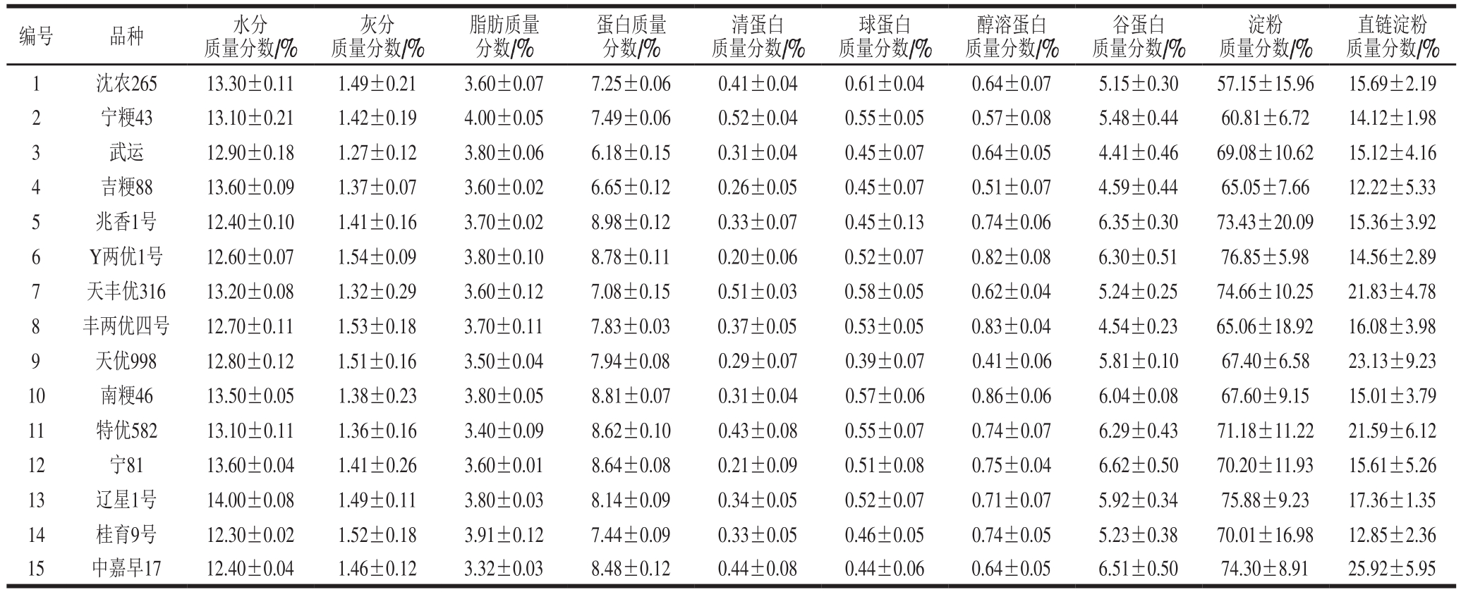 编号 品种 水分质量分数/%灰分质量分数/%脂肪质量分数/%蛋白质量分数/%清蛋白质量分数/%球蛋白质量分数/%醇溶蛋白质量分数/%谷蛋白质量分数/%淀粉质量分数/%直链淀粉质量分数/%1 沈农265 13.30±0.11 1.49±0.21 3.60±0.07 7.25±0.06 0.41±0.04 0.61±0.04 0.64±0.07 5.15±0.30 57.15±15.96 15.69±2.19 2 宁粳43 13.10±0.21 1.42±0.19 4.00±0.05 7.49±0.06 0.52±0.04 0.55±0.05 0.57±0.08 5.48±0.44 60.81±6.72 14.12±1.98 3 武运 12.90±0.18 1.27±0.12 3.80±0.06 6.18±0.15 0.31±0.04 0.45±0.07 0.64±0.05 4.41±0.46 69.08±10.62 15.12±4.16 4 吉粳88 13.60±0.09 1.37±0.07 3.60±0.02 6.65±0.12 0.26±0.05 0.45±0.07 0.51±0.07 4.59±0.44 65.05±7.66 12.22±5.33 5 兆香1号 12.40±0.10 1.41±0.16 3.70±0.02 8.98±0.12 0.33±0.07 0.45±0.13 0.74±0.06 6.35±0.30 73.43±20.09 15.36±3.92 6 Y两优1号 12.60±0.07 1.54±0.09 3.80±0.10 8.78±0.11 0.20±0.06 0.52±0.07 0.82±0.08 6.30±0.51 76.85±5.98 14.56±2.89 7 天丰优316 13.20±0.08 1.32±0.29 3.60±0.12 7.08±0.15 0.51±0.03 0.58±0.05 0.62±0.04 5.24±0.25 74.66±10.25 21.83±4.78 8 丰两优四号 12.70±0.11 1.53±0.18 3.70±0.11 7.83±0.03 0.37±0.05 0.53±0.05 0.83±0.04 4.54±0.23 65.06±18.92 16.08±3.98 9 天优998 12.80±0.12 1.51±0.16 3.50±0.04 7.94±0.08 0.29±0.07 0.39±0.07 0.41±0.06 5.81±0.10 67.40±6.58 23.13±9.23 10 南粳46 13.50±0.05 1.38±0.23 3.80±0.05 8.81±0.07 0.31±0.04 0.57±0.06 0.86±0.06 6.04±0.08 67.60±9.15 15.01±3.79 11 特优582 13.10±0.11 1.36±0.16 3.40±0.09 8.62±0.10 0.43±0.08 0.55±0.07 0.74±0.07 6.29±0.43 71.18±11.22 21.59±6.12 12 宁81 13.60±0.04 1.41±0.26 3.60±0.01 8.64±0.08 0.21±0.09 0.51±0.08 0.75±0.04 6.62±0.50 70.20±11.93 15.61±5.26 13 辽星1号 14.00±0.08 1.49±0.11 3.80±0.03 8.14±0.09 0.34±0.05 0.52±0.07 0.71±0.07 5.92±0.34 75.88±9.23 17.36±1.35 14 桂育9号 12.30±0.02 1.52±0.18 3.91±0.12 7.44±0.09 0.33±0.05 0.46±0.05 0.74±0.05 5.23±0.38 70.01±16.98 12.85±2.36 15 中嘉早17 12.40±0.04 1.46±0.12 3.32±0.03 8.48±0.12 0.44±0.08 0.44±0.06 0.64±0.05 6.51±0.50 74.30±8.91 25.92±5.95