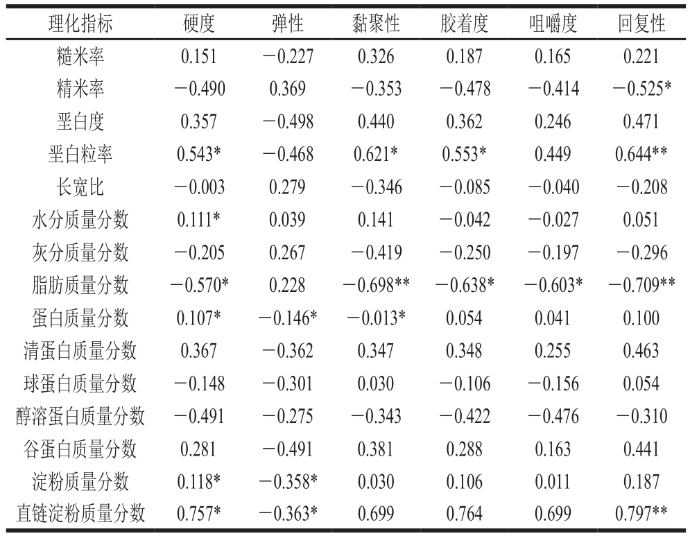 理化指标 硬度 弹性 黏聚性 胶着度 咀嚼度 回复性糙米率 0.151 -0.227 0.326 0.187 0.165 0.221精米率 -0.490 0.369 -0.353 -0.478 -0.414 -0.525*垩白度 0.357 -0.498 0.440 0.362 0.246 0.471垩白粒率 0.543* -0.468 0.621* 0.553* 0.449 0.644**长宽比 -0.003 0.279 -0.346 -0.085 -0.040 -0.208水分质量分数 0.111* 0.039 0.141 -0.042 -0.027 0.051灰分质量分数 -0.205 0.267 -0.419 -0.250 -0.197 -0.296脂肪质量分数 -0.570* 0.228 -0.698** -0.638* -0.603* -0.709**蛋白质量分数 0.107* -0.146* -0.013* 0.054 0.041 0.100清蛋白质量分数 0.367 -0.362 0.347 0.348 0.255 0.463球蛋白质量分数 -0.148 -0.301 0.030 -0.106 -0.156 0.054醇溶蛋白质量分数 -0.491 -0.275 -0.343 -0.422 -0.476 -0.310谷蛋白质量分数 0.281 -0.491 0.381 0.288 0.163 0.441淀粉质量分数 0.118* -0.358* 0.030 0.106 0.011 0.187直链淀粉质量分数 0.757* -0.363* 0.699 0.764 0.699 0.797**