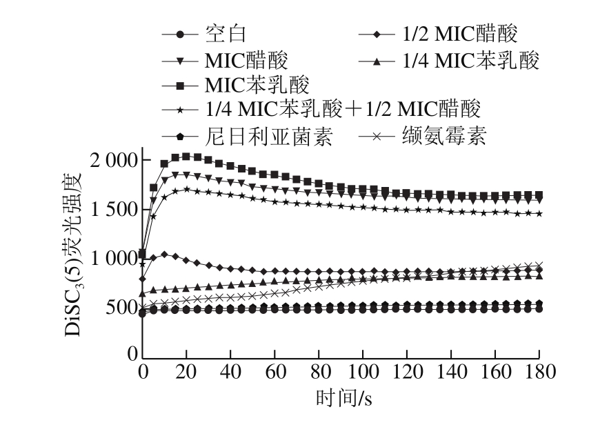 采用DiSC3(5)考察苯乳酸、醋酸对单核细胞增生李斯特菌膜电位的影响。收集对数期的细菌,清洗并用5 mmol/L HEPES缓冲液(pH 7.2~7.4,含10 mmol/L葡萄糖)重悬至2×108 CFU/mL。然后,将DiSC3(5)加入到细胞悬液中,使其终浓度为1 μmol/L,于30 ℃黑暗条件下温育15 min。之后清洗、重悬,并加入KCl,使其终浓度为100 mmol/L,以平衡细胞质和外部钾离子浓度。最后,用等体积的抑菌剂与菌悬液于比色皿中混匀,以缬氨霉素(18 mmol/L)处理组作为阳性对照,尼日利亚菌素(2 mmol/L)处理组作为阴性对照,在激发波长650 nm、发射波长672 nm条件下测定荧光强度变化。