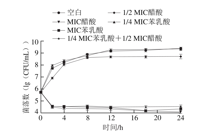 将培养至对数期的单核细胞增生李斯特菌接种到新鲜营养肉汤中,使其浓度为106 CFU/mL,然后加入不同质量浓度的抑菌剂,分别为1/4 MIC、MIC的苯乳酸,1/2 MIC、MIC的醋酸,以及1/4 MIC苯乳酸+1/2 MIC醋酸,然后于37 ℃恒温培养箱培养。在适当的时间点取样并采用平板计数法测定培养活菌数。以时间为横坐标,活菌数的对数值为纵坐标绘制时间-杀菌曲线。