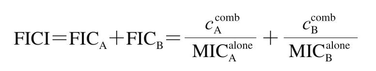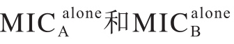 分别是A和B在组合中的有效浓度。当FICI≤0.5,表明二者具有协同作用;0.5<FICI≤0.75,表明二者具有部分协同作用,0.75<FICI≤1,表明二者具有相加作用;1<FICI≤2,表明二者具有无关作用;FICI>2,表明二者具有拮抗作用。