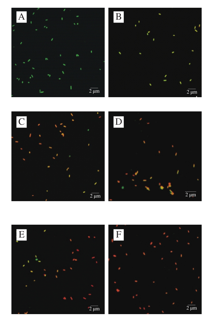采用SYTO9和PI两种荧光染料对细胞染色观察苯乳酸与醋酸对细胞膜完整性的影响[27]。SYTO9能将所有细胞染色并发出绿色荧光,PI只能穿透细胞膜受损的细胞与核酸结合发出红色荧光,因此可以用来观察受损伤的细胞。从图4可以看到,未经处理的单核细胞增生李斯特菌发出绿色荧光(图4A),表明细胞膜完整。经过1/4 MIC苯乳酸处理后,细胞发出黄绿色荧光(图4B),经过1/2 MIC醋酸处理后的大部分菌体发出黄色荧光(图4D),表明细胞膜受到损坏,而经过MIC苯乳酸、MIC醋酸、1/4 MIC苯乳酸+1/2 MIC醋酸处理后的菌体发出橙色或者橙红色(图4C、E、F),表明细胞膜受到严重破坏。