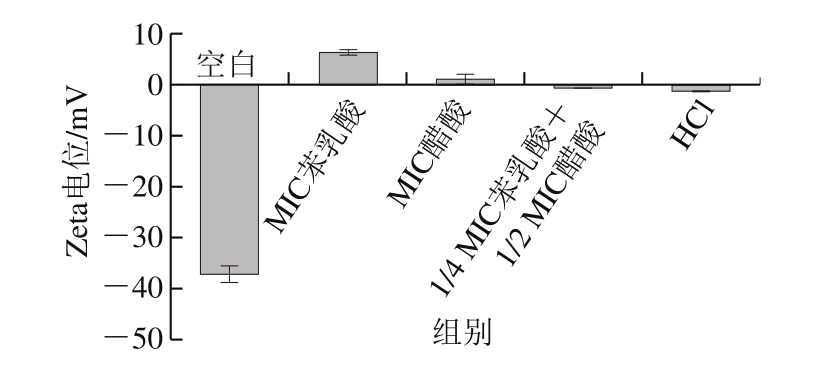 采用马尔文激光粒度仪考察了苯乳酸、醋酸对单核细胞增生李斯特菌Zeta电位的影响。取生长对数期的单核细胞增生李斯特菌,4 700×g离心10 min,用无菌超纯水清洗重悬,调节菌体浓度至2×108 CFU/mL。取1 mL菌悬液分别与1 mL不同质量浓度抑菌剂等体积混匀,用超纯水作空白对照,以pH 3的HCl溶液作阳性对照,在37 ℃下孵育1 h后用马尔文激光粒度分析仪进行电位检测。