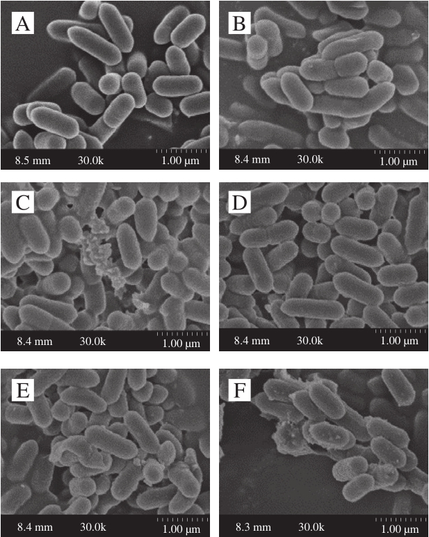 采用扫描电子显微镜考察单核细胞增生李斯特菌外部形态的变化。将收集好的细胞用0.1 mol/L 磷酸盐缓冲液清洗后,在4 ℃下用体积分数2.5%戊二醛溶液固定过夜。然后用乙醇(体积分数分别为30%、50%、70%、85%、90%、100%)进行梯度脱水,每次15 min,无水乙醇脱水两次。之后用乙酸异戊酯将乙醇置换两次,冷冻干燥后通过扫描电子显微镜观察。
