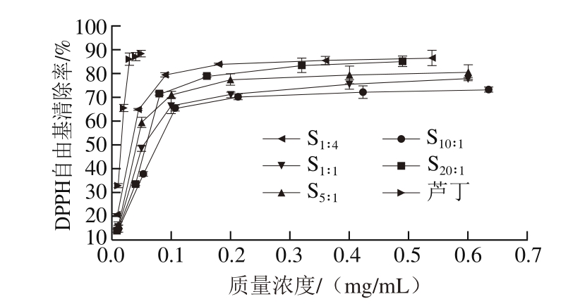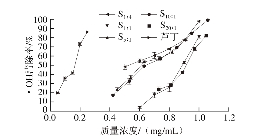 由图4可知,β-酸对DPPH自由基具有一定的清除能力,随着质量浓度的增加,所有样品对DPPH自由基的清除率均呈上升趋势,且β-酸同系物的比例明显影响样品对DPPH自由基的清除能力。β-酸同系物样品清除DPPH自由基的IC50依次为S1∶4(0.033 mg/mL)<S5∶1(0.042 mg/mL)<S1∶1(0.054 mg/mL)≈S20∶1(0.057 mg/mL)<S10∶1(0.077 mg/mL),清除能力均低于阳性对照品芦丁(0.015 mg/mL)。与抑制黄嘌呤氧化酶活性类似,正蛇麻酮+加蛇麻酮比例较高的样品S1∶4清除DPPH自由基的能力较强。Ma Yongkai等[42]在研究抗氧化肽同系物的抗氧化活性过程中发现,抗氧化肽清除DPPH自由基的能力不仅与氨基酸的组成和关键氨基酸位点有关,而且还与抗氧化肽的空间构型以及同系物分子质量有关,表明同系物之间在清除DPPH自由基能力上存在差异,这与本研究结果类似。
