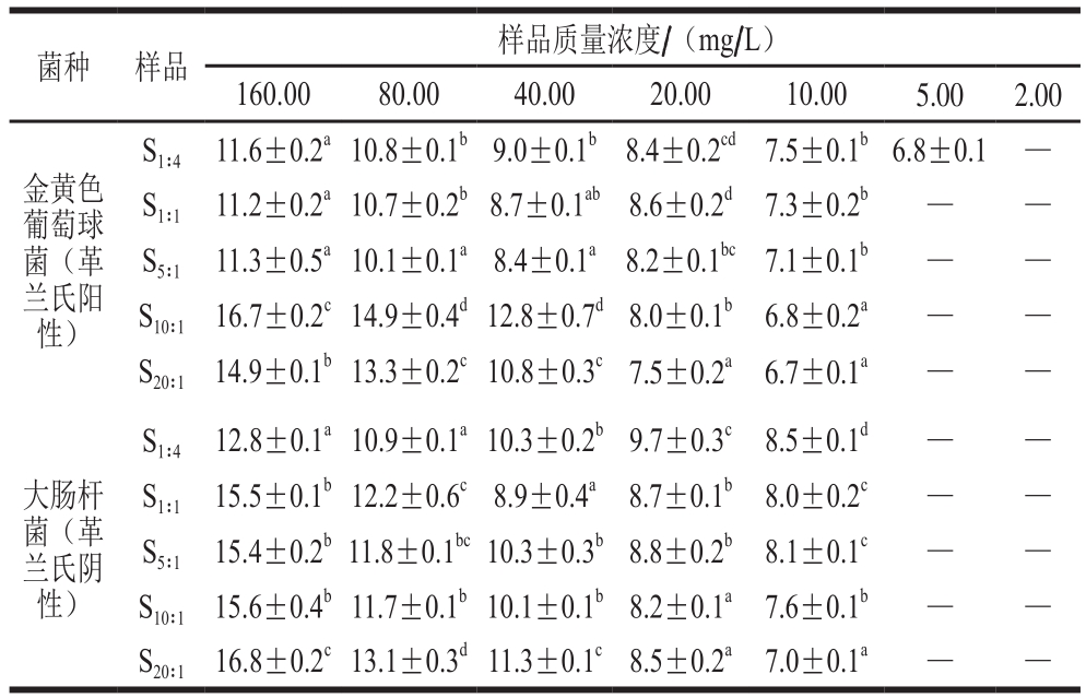 菌种 样品 样品质量浓度/(mg/L)160.00 80.00 40.00 20.00 10.00 5.00 2.00金黄色葡萄球菌(革兰氏阳性)S1∶4 11.6±0.2a10.8±0.1b9.0±0.1b 8.4±0.2cd 7.5±0.1b6.8±0.1 —S1∶1 11.2±0.2a10.7±0.2b8.7±0.1ab 8.6±0.2d 7.3±0.2b — —S5∶1 11.3±0.5a10.1±0.1a8.4±0.1a 8.2±0.1bc 7.1±0.1b — —S10∶1 16.7±0.2c14.9±0.4d12.8±0.7d8.0±0.1b 6.8±0.2a — —S20∶1 14.9±0.1b13.3±0.2c10.8±0.3c7.5±0.2a 6.7±0.1a — —大肠杆菌(革兰氏阴性)S1∶4 12.8±0.1a10.9±0.1a10.3±0.2b9.7±0.3c 8.5±0.1d — —S1∶1 15.5±0.1b12.2±0.6c8.9±0.4a 8.7±0.1b 8.0±0.2c — —S5∶1 15.4±0.2b11.8±0.1bc10.3±0.3b8.8±0.2b 8.1±0.1c — —S10∶1 15.6±0.4b11.7±0.1b10.1±0.1b8.2±0.1a 7.6±0.1b — —S20∶1 16.8±0.2c13.1±0.3d11.3±0.1c8.5±0.2a 7.0±0.1a — —