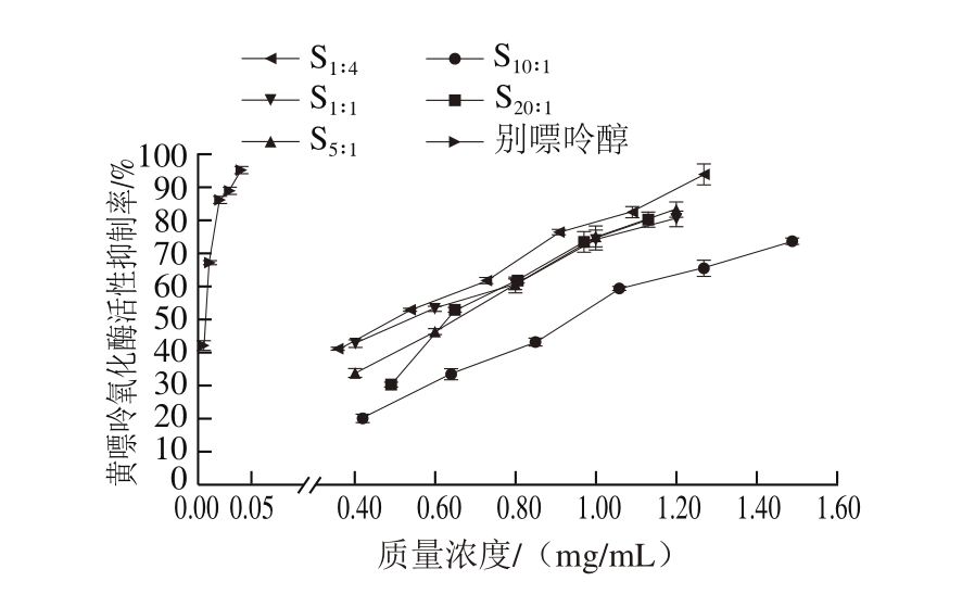 黄嘌呤氧化酶是人体内核酸分解代谢中的重要组分,能催化(次)黄嘌呤产生尿酸[33],同时代谢产物会引起氧化应激[34],两者都是导致痛风的重要因素[35]。目前临床治疗痛风的药物主要有别嘌呤醇[36]、秋水仙素[37]、半胱氨酸[38]等。但这些药物具有较强的毒副作用,因此寻找高效低毒的新型抑制剂备受关注[39]。由图3可知,β-酸对黄嘌呤氧化酶的活性具有一定的抑制作用,随着质量浓度的增加,所有样品对黄嘌呤氧化酶活性抑制率呈明显上升趋势,且β-酸同系物的比例显著明显影响样品对黄嘌呤氧化酶活性的抑制能力。由图3可知,几种β-酸同系物样品抑制黄嘌呤氧化酶的IC50依次为S1∶4(0.50 mg/mL)<S1∶1(0.53 mg/mL)<S5∶1(0.65 mg/mL)≈S20∶1(0.63 mg/mL)<S10∶1(0.94 mg/mL),即随着正蛇麻酮+加蛇麻酮比例的下降抑制能力总体逐渐减小,表明正蛇麻酮+加蛇麻酮对黄嘌呤氧化酶活性的抑制能力高于合蛇麻酮。尽管S1∶4样品对黄嘌呤氧化酶活性抑制能力明显高于其他样品,但与阳性对照品别嘌呤醇相比活性明显较差。Mir等[40]以十六烷基三甲基溴化铵为例,研究同系物对黄嘌呤氧化酶活性的抑制作用,结果表明,同系物的分子链长短、分子质量会显著影响其与黄嘌呤氧化酶的结合,进而影响其抑制活性;柳高[41]对B族维生素对小鼠尿酸水平影响的研究结果也证明B族维生素同系物之间在抑制黄嘌呤氧化酶上存在显著性差异,上述研究均与本研究结果相似。