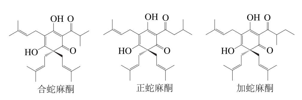 与α-酸相同,β-酸同样存在3 种主要同系物:合蛇麻酮、正蛇麻酮和加蛇麻酮,结构如图1所示。