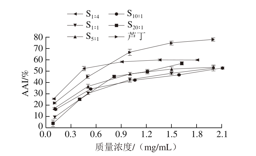 由图6可知,β-酸在胡萝卜素-亚油酸乳化体系中具有较好的总抗氧化能力,随着质量浓度的增加,所有样品的AAI均呈上升趋势,且β-酸同系物的比例对样品的总抗氧化能力具有明显影响。5 种样品的总抗氧化活性达到50%时对应的样品质量浓度依次为S1∶4(0.43 mg/mL)<S20∶1(1.24 mg/mL)≈S5∶1(1.32 mg/mL)<S1∶1(1.74 mg/mL)<S10∶1(1.90 mg/mL),与阳性对照芦丁(0.623 mg/mL)相比,S1∶4样品的总抗氧化能力更高,且S1∶4样品抗氧化活性要明显好于其他比例的样品。该结果与前述各抗氧化评价体系中得出的正蛇麻酮+加蛇麻酮的抗氧化能力强于合蛇麻酮的结果一致。