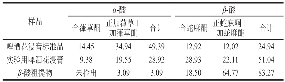 表1 酒花浸膏标准品、实验用啤酒花浸膏和β-酸粗提物中各组分的相对含量